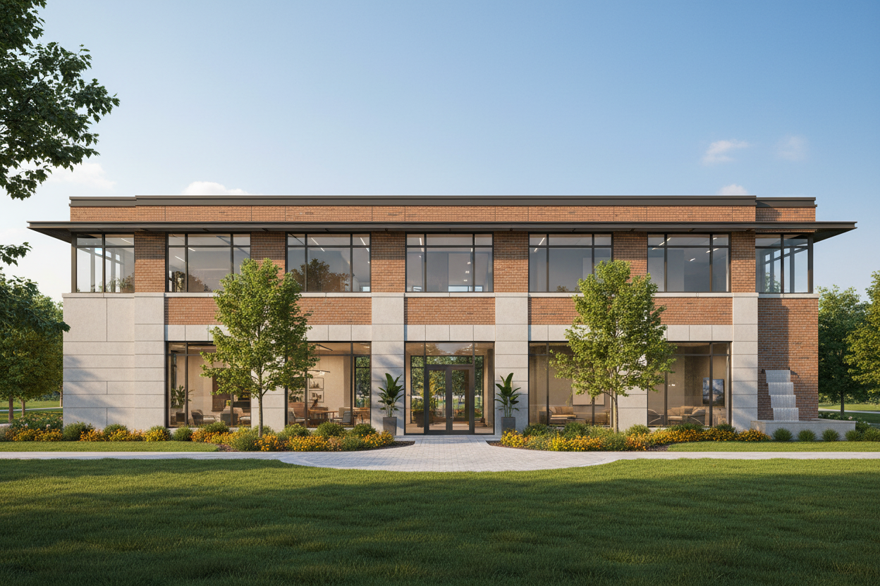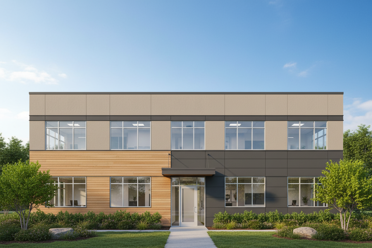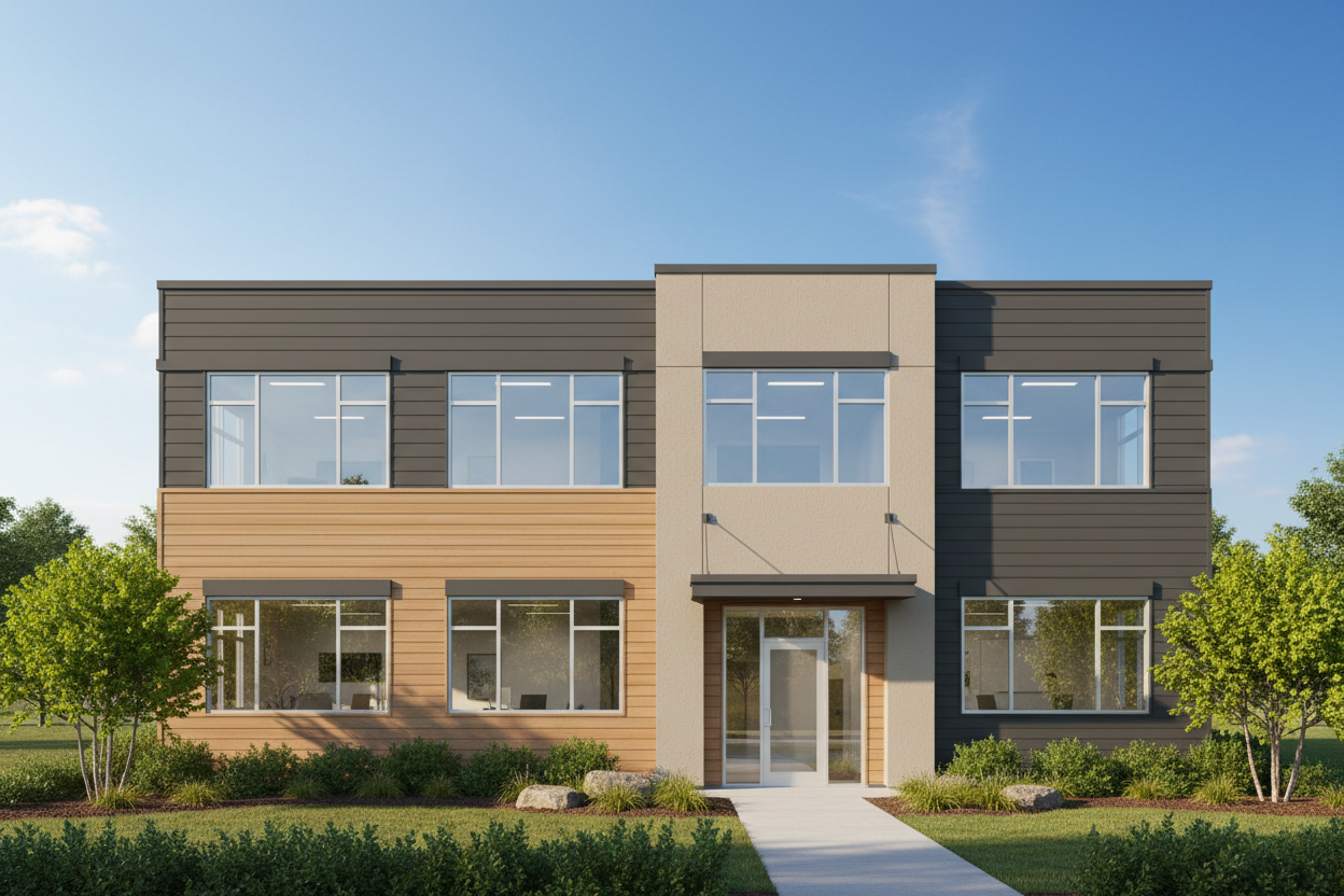 contemporary warm and welcoming proffessional office building 2 storeys in height uniform windows materials wood metal siding and stucco