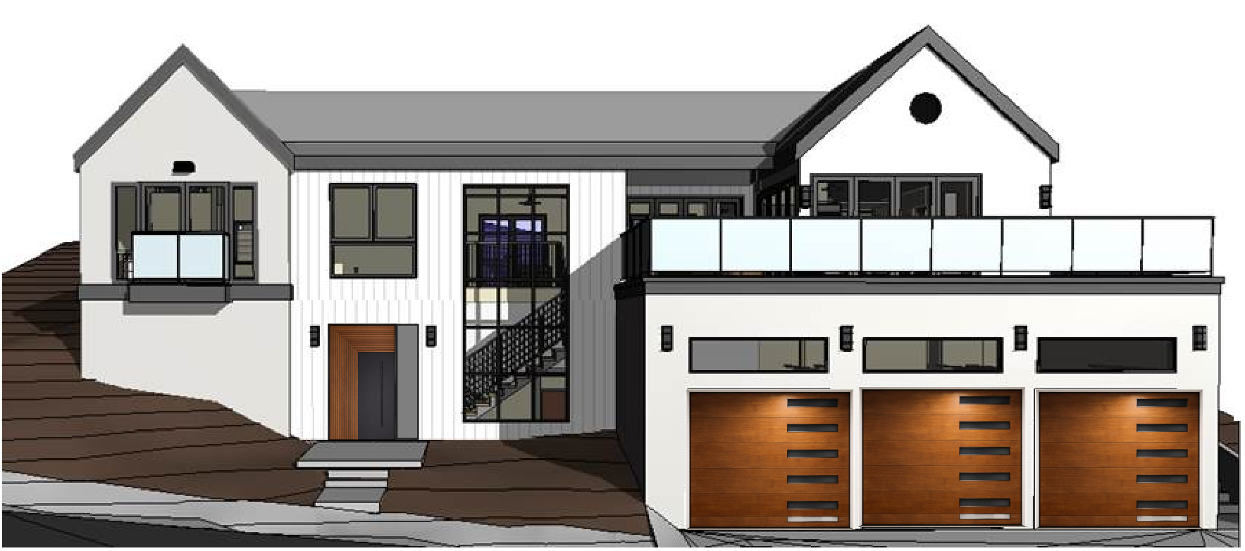 render this house with white stone on the garage and left side hip element vertical white siding on the other faces replace the glass rail with cable rail