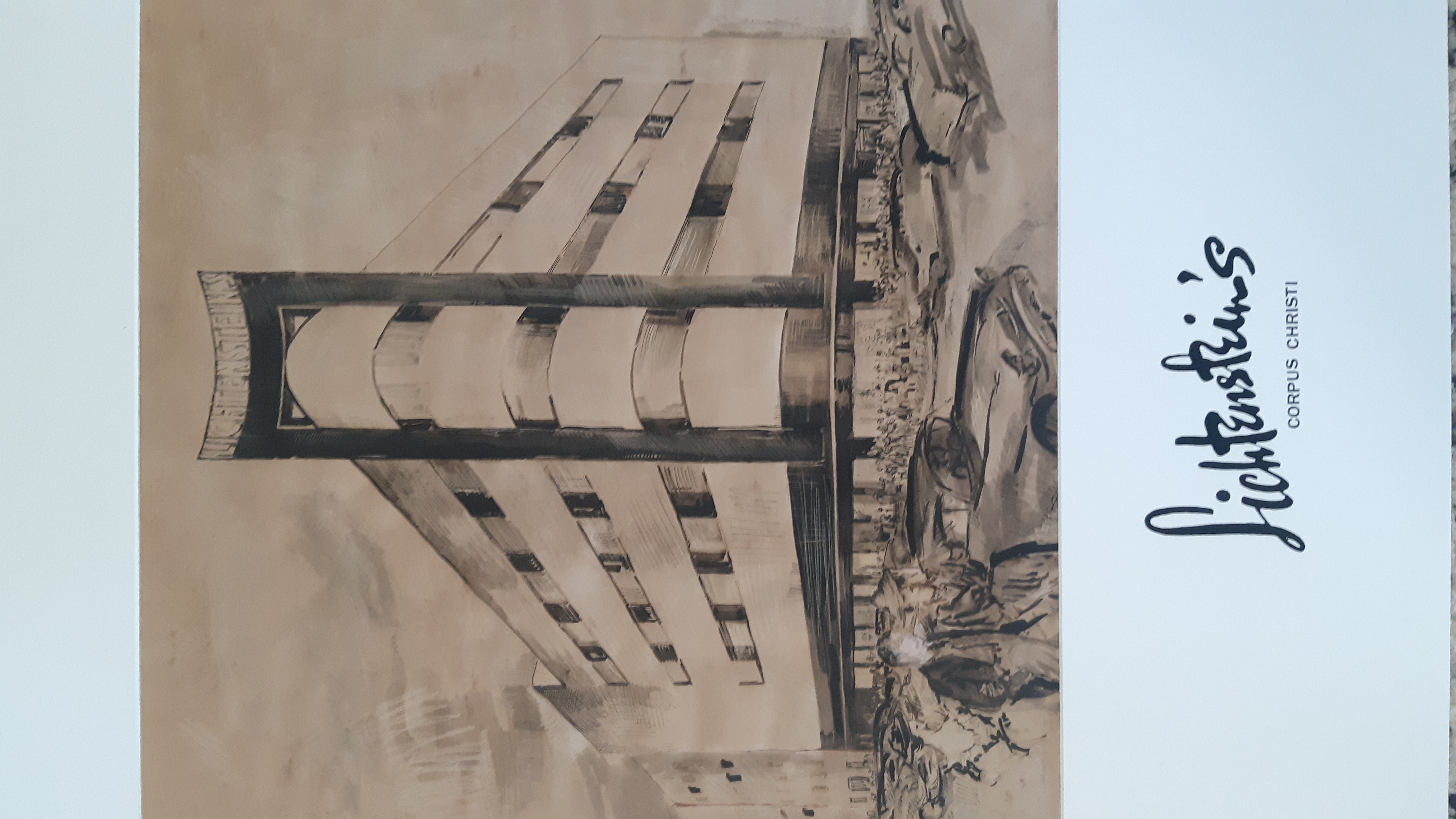 convert this rendering to a true to life image the main wall finish is buff colored brick the dark area above the first floor display windows is black the sign and the vertical supports for the sign are dark bronze metal render the image with the same street scene with 1950 s vehicles and people walking around exactly as shown in the image