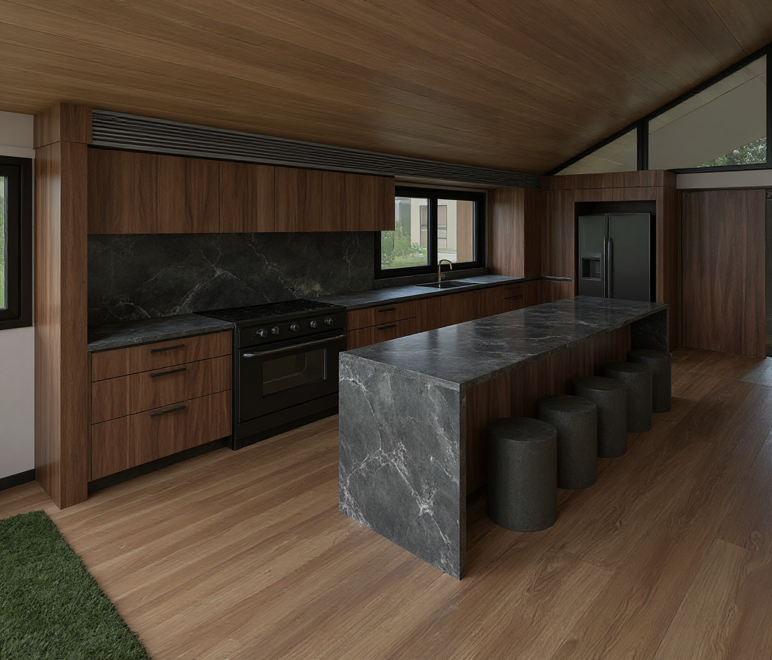 render a modern house with a sleek contemporary design the exterior features a mix of lap hardie board and stone textures the hardie board is a dark gray while the stone accents are a warm beige the windows are large and reflective framed with black trim the roof is black surround the house with lush greenery including blooming flowers in vibrant colors such as lavender and soft pink it is golden hour suggesting a serene sunset the overall atmosphere is peaceful and inviting enhanced by soft warm lighting illuminating the exterior