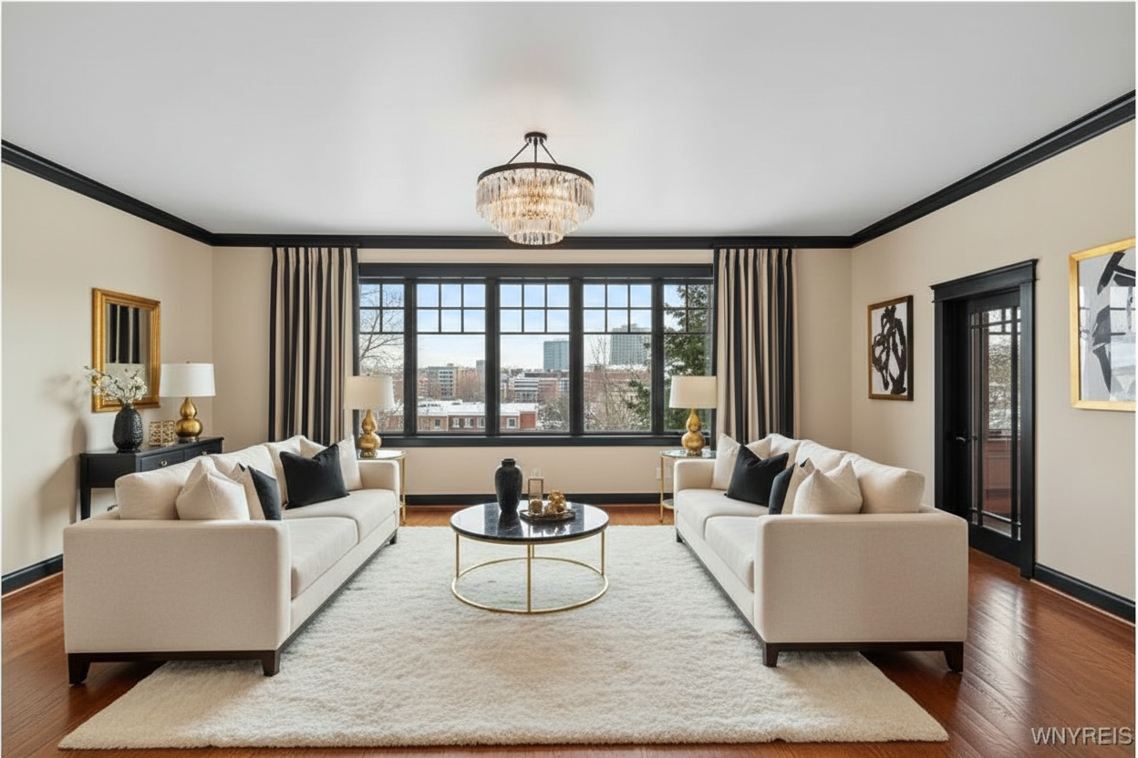 exterior shot make the interior of living room apply the mood board with modern minimalist style