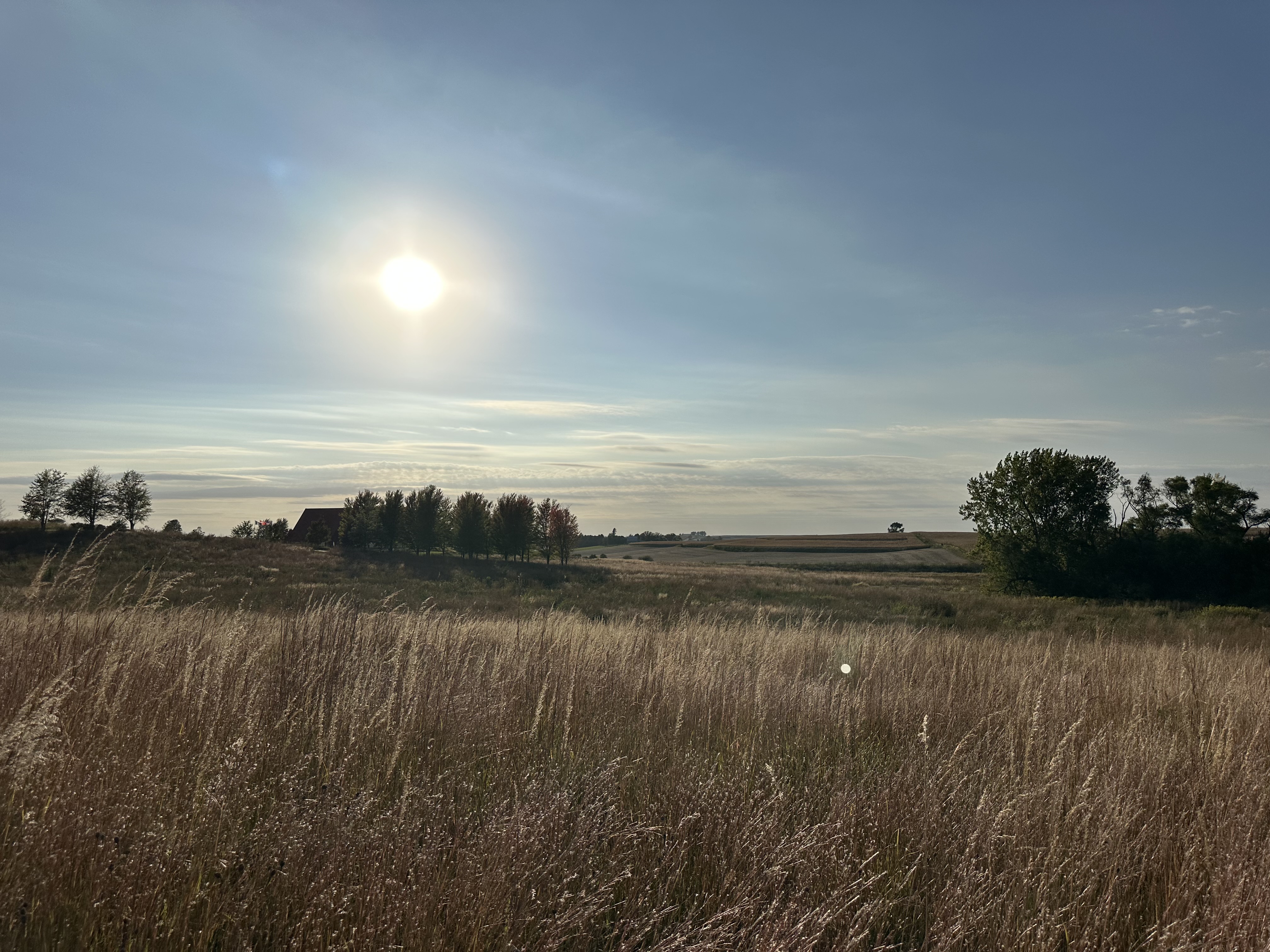 show this view through a modern bird blind with people looking at birds some people with binoculars with birds in the distance