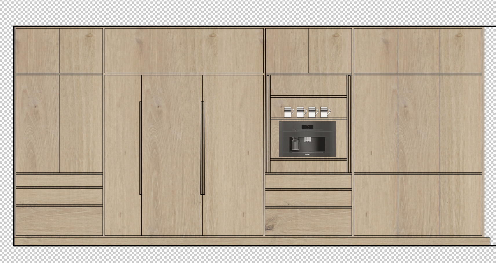 natural oak millwork with light stain and integrated drawer and cabinet pulls built in coffee machine with tucked away pocket doors