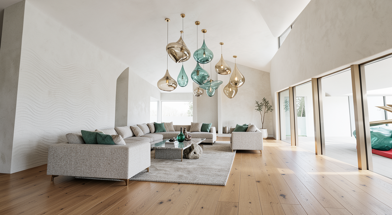 monumental double height living room with sculptural architectural ceiling bright white ceiling and soft diffused daylight warm wide plank oak hardwood flooring calm mineral plaster walls large scale contemporary seating in neutral textured fabrics lagoon atmosphere created through reflective and translucent elements a large sculptural glass pendant installation suspended in the double height space subtle reflective surfaces in polished metal and glass low tables in tinted glass or stone muted accents in deep teal and sea green introduced sparingly minimal curated styling serene and luminous quiet luxury interior wide angle architectural rendering emphasize light reflection and spatial calm