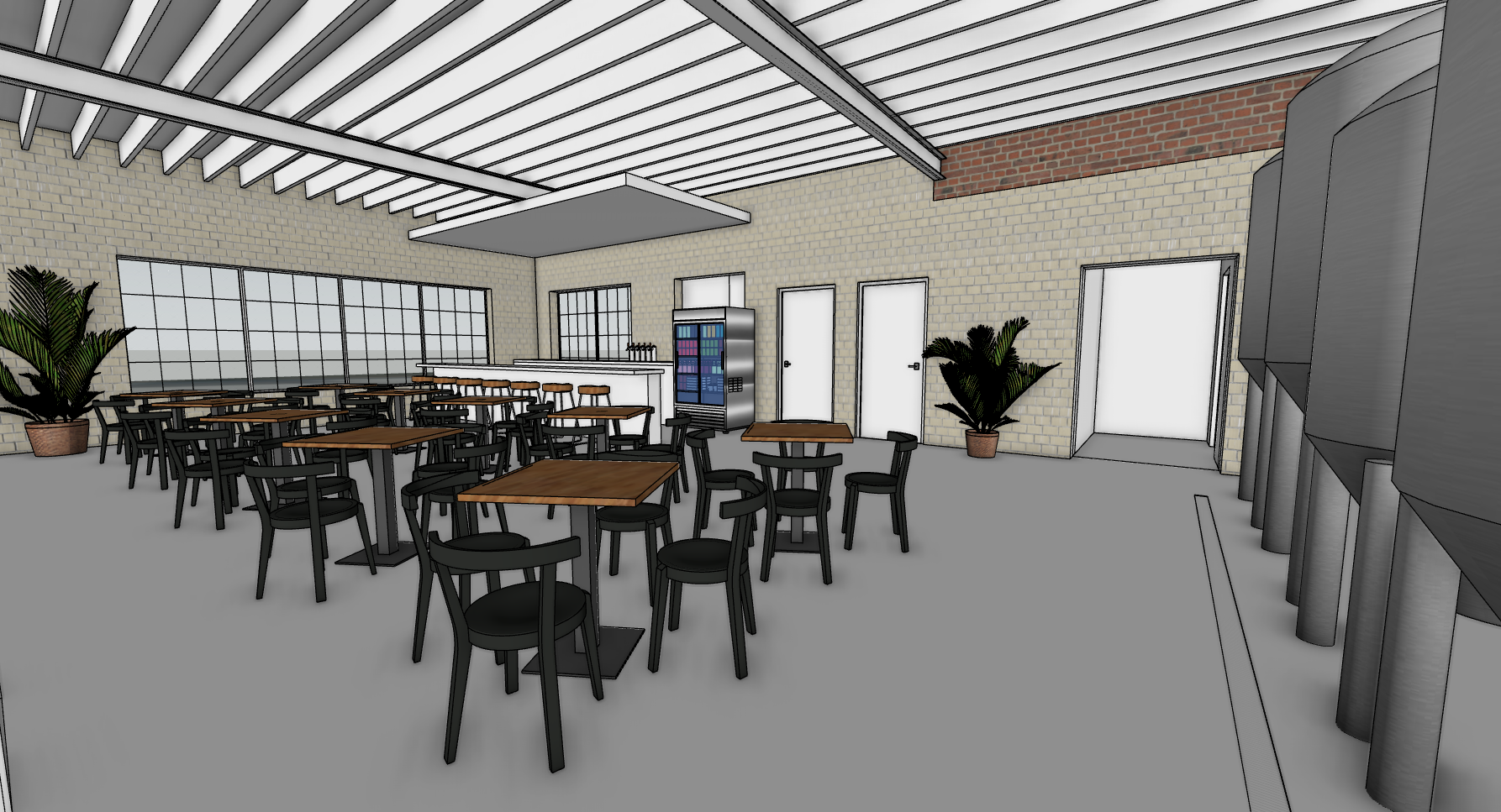 taproom brew pub scene night time with bartenders and patrons standing and seated materials expoxy painted floor white painted wood ceiling joists stainless steel brewing equipment