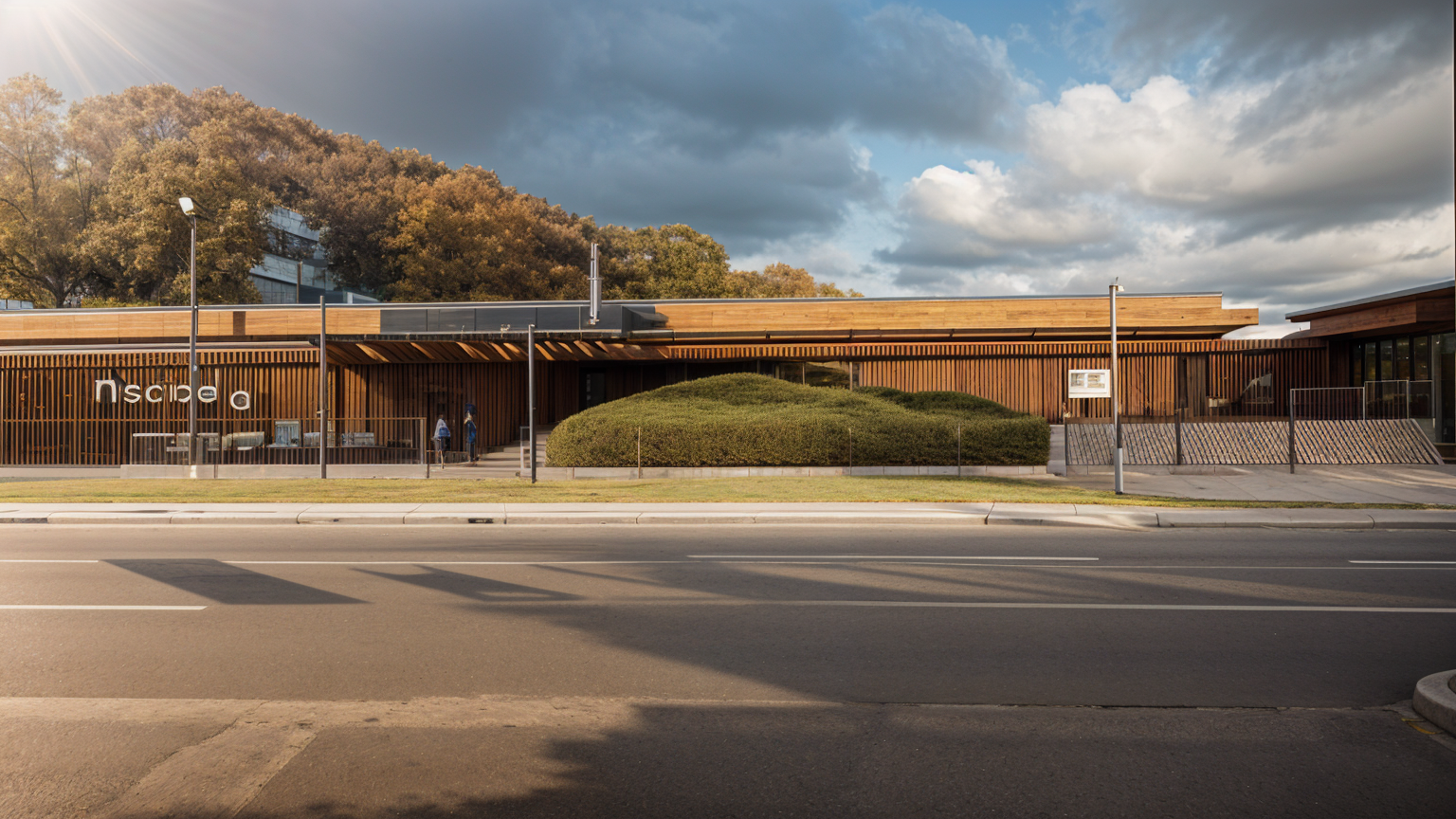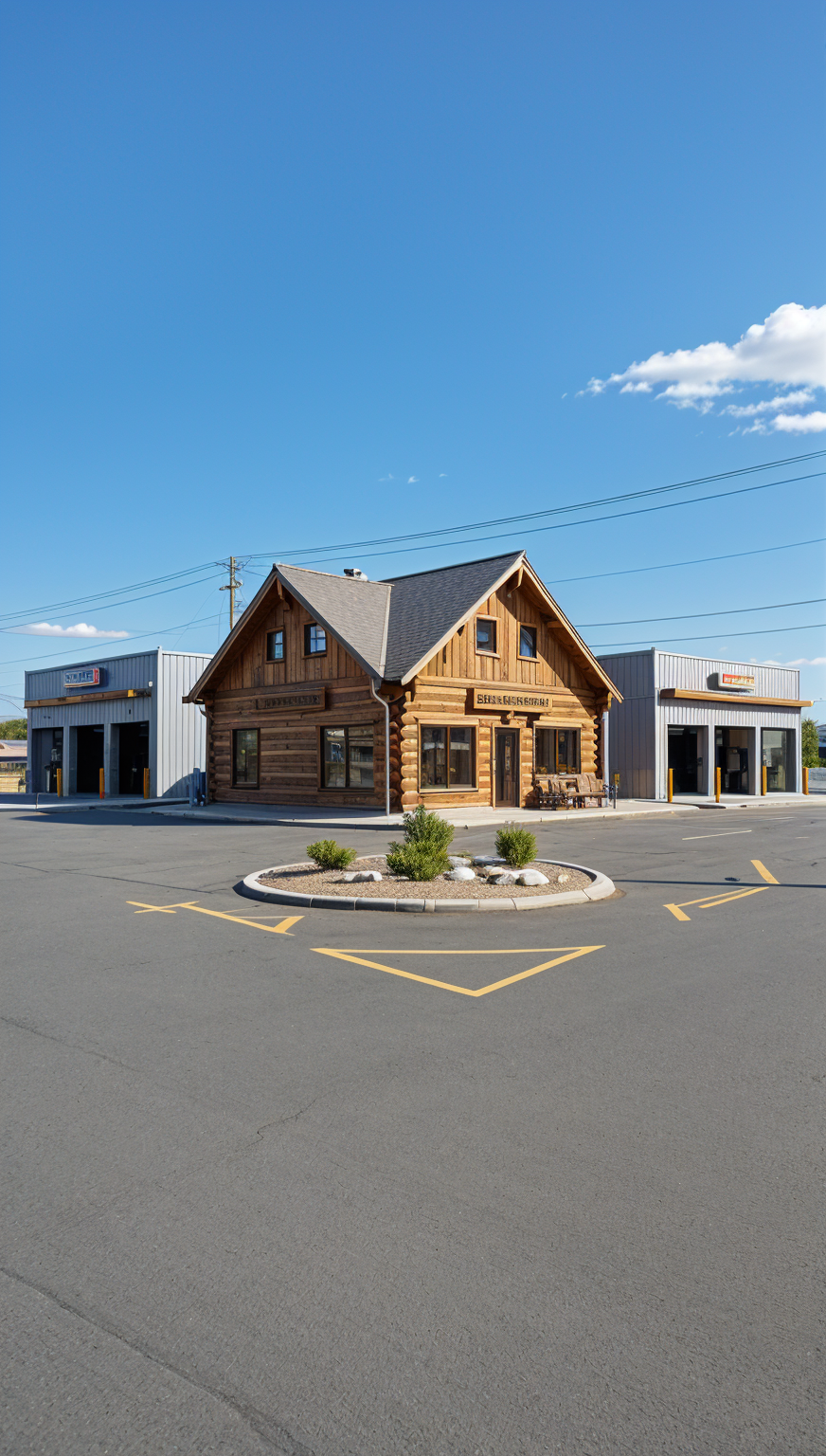 i want you to imagine 3 buildings two car wash modern look with only one garage door each 24 x40 and the second one 30 x50 and a log building in the middle that will be a store corner of the road with two entrance asphalte all the way