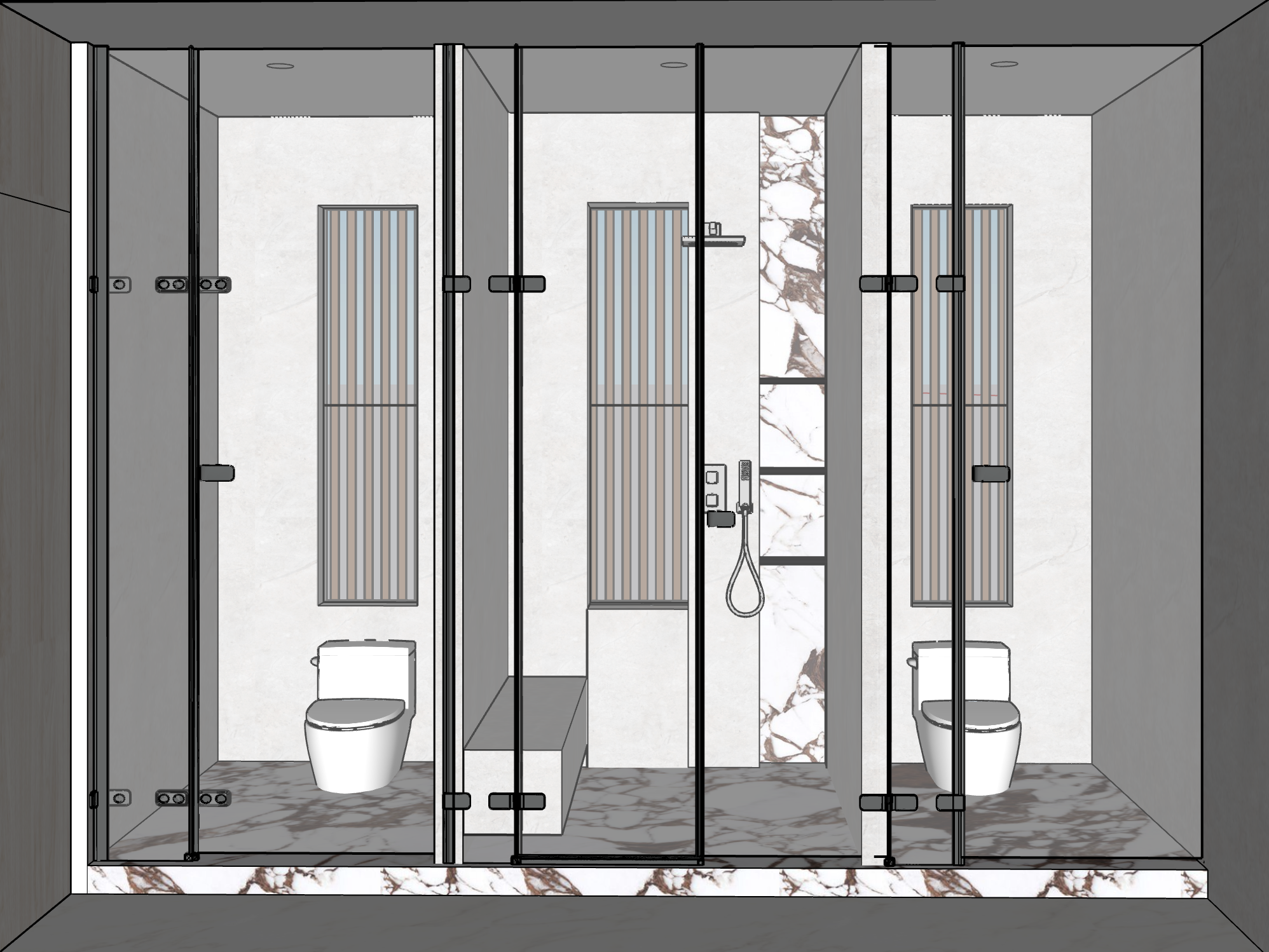modern master bathroom wet room with symmetrical layout three glass enclosed zones with no framing wc on left walk in shower centered with handheld fixture and built in bench and wc on right walls and bench in light stone finish floor and vertical accent strips in bold dark red veined marble minimalist slot windows with wooden vertical slatted privacy screens clean architectural lines quiet luxury soft natural daylight subtle wall reflections refined and spa like atmosphere with realistic stone and glass textures