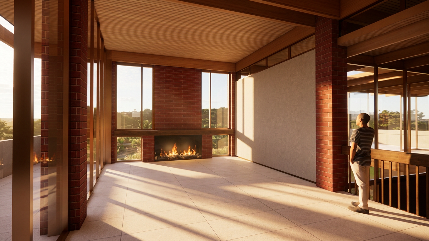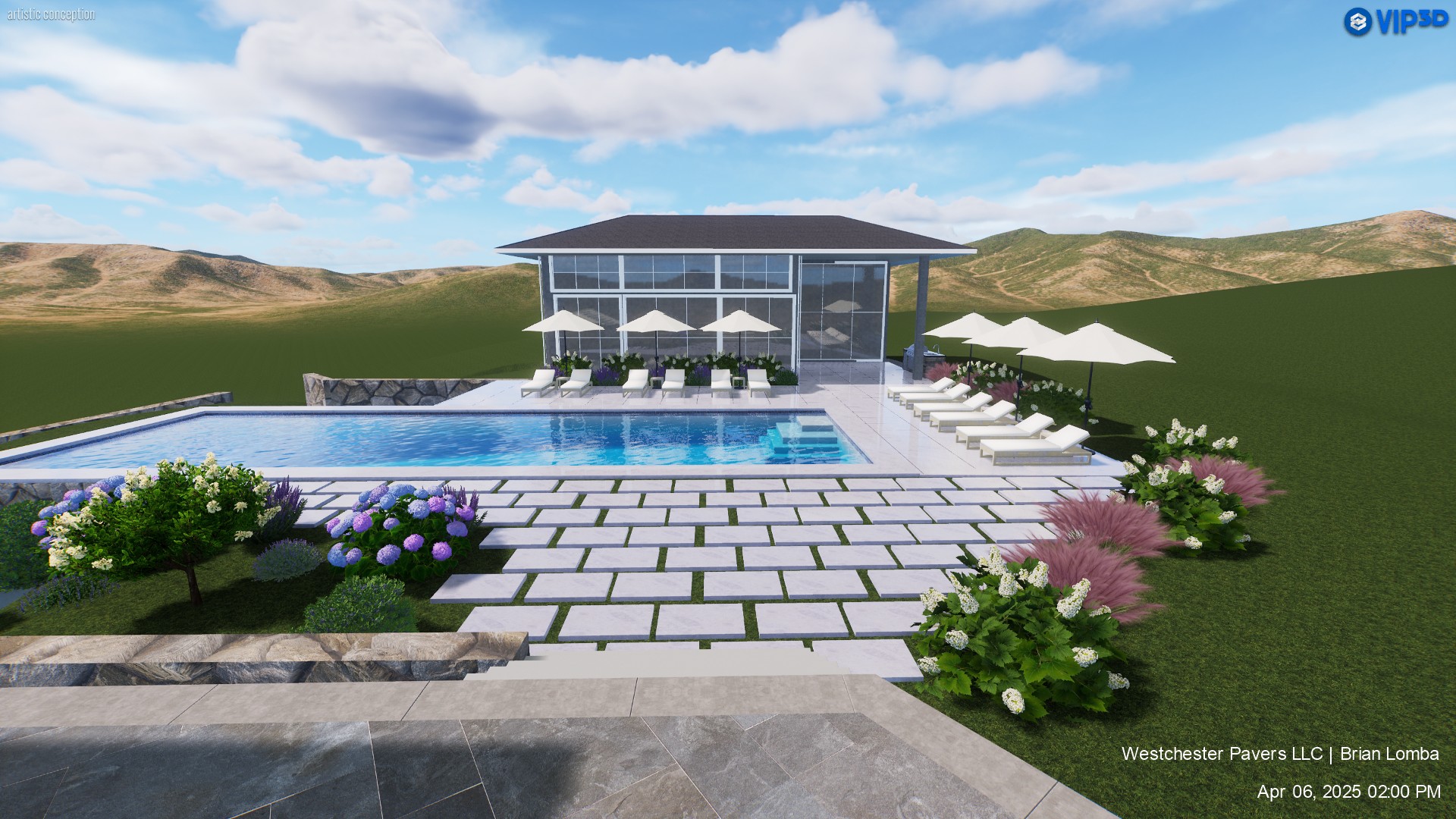 render a photorealistic 3d perspective of this pool patio and pool house in greenwich ct reference the current material style just enhance them black standing seam metal roof all glass european floor to cieling windows concrete gunite pool turkish marble paving 2x2 2x3 pavers in grass stone walls keep model geometry the same windows doors roof walls make a lush vegetation that looks native to greenwich ct large 15 acre estate do not change the view only enhance the current materials and make the landscape nicer vegetation detailed textures in the patio and pool and glass reflections and a vibrant clear sky with light atmospheric depth render in hyper realistic architectural visualization quality 8k resolution