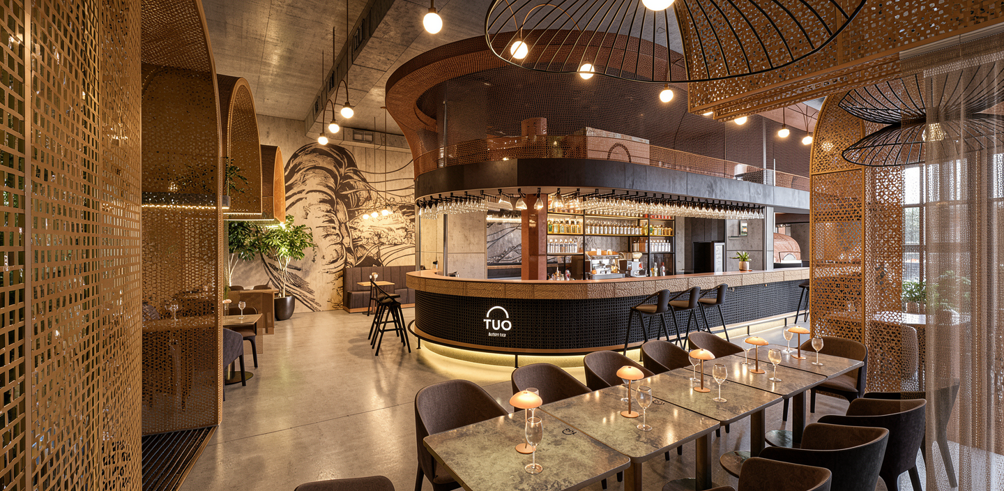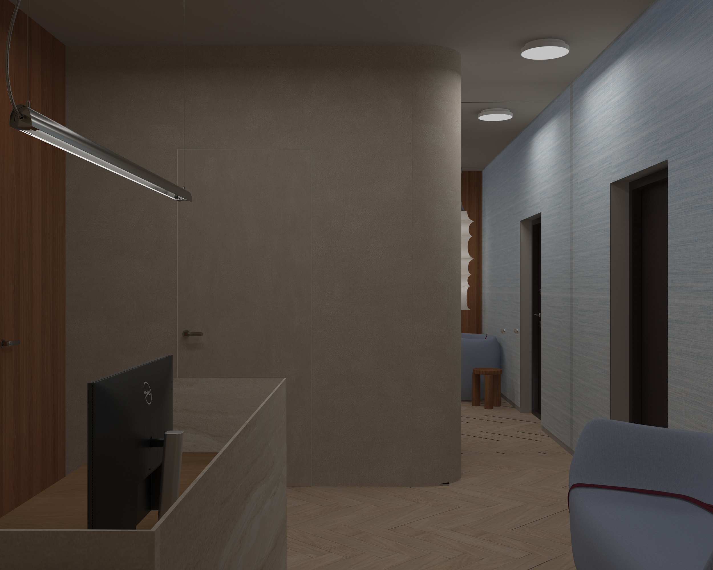 strictly preserve the original geometry all modeled elements and the composition do not move scale reshape replace remove or reinterpret any objects materials textures or architectural elements all changes must be strictly limited to improving render quality material realism lighting shading and global illumination the wall on the right is covered with wallpaper featuring a light blue fabric texture the surface should read as soft textile matte with subtle weave visibility and realistic light absorption all materials must follow physically accurate pbr principles including correct roughness reflectivity texture resolution and realistic behavior under artificial lighting subtle reflections proper light absorption and accurate color response only the front wall is finished with natural delicate beige plaster lighting should gently reveal the subtle surface texture and soft tonal variations maintaining a matte mineral appearance avoid harsh shadows strong highlights or exaggerated contrast the floor is natural light oak herringbone parquet strictly preserve the exact layout direction proportions and plank arrangement the surface must remain matte and natural with no gloss or polish the pendant lamp above the counter is the radent pendant lamp by gejst providing controlled direct downlight and subtle uplight through perforated metal lighting should remain calm neutral and architectural artificial lighting is the primary illumination source no dramatic contrast no cinematic effects no stylization the wardrobe on the right has mirrored surface panels and round knob handles these elements must remain unchanged in form size position and finish the final result should be a high end photorealistic architectural visualization with improved render quality and lighting realism while perfectly preserving all geometry materials patterns and modeled details exactly as in the original scene