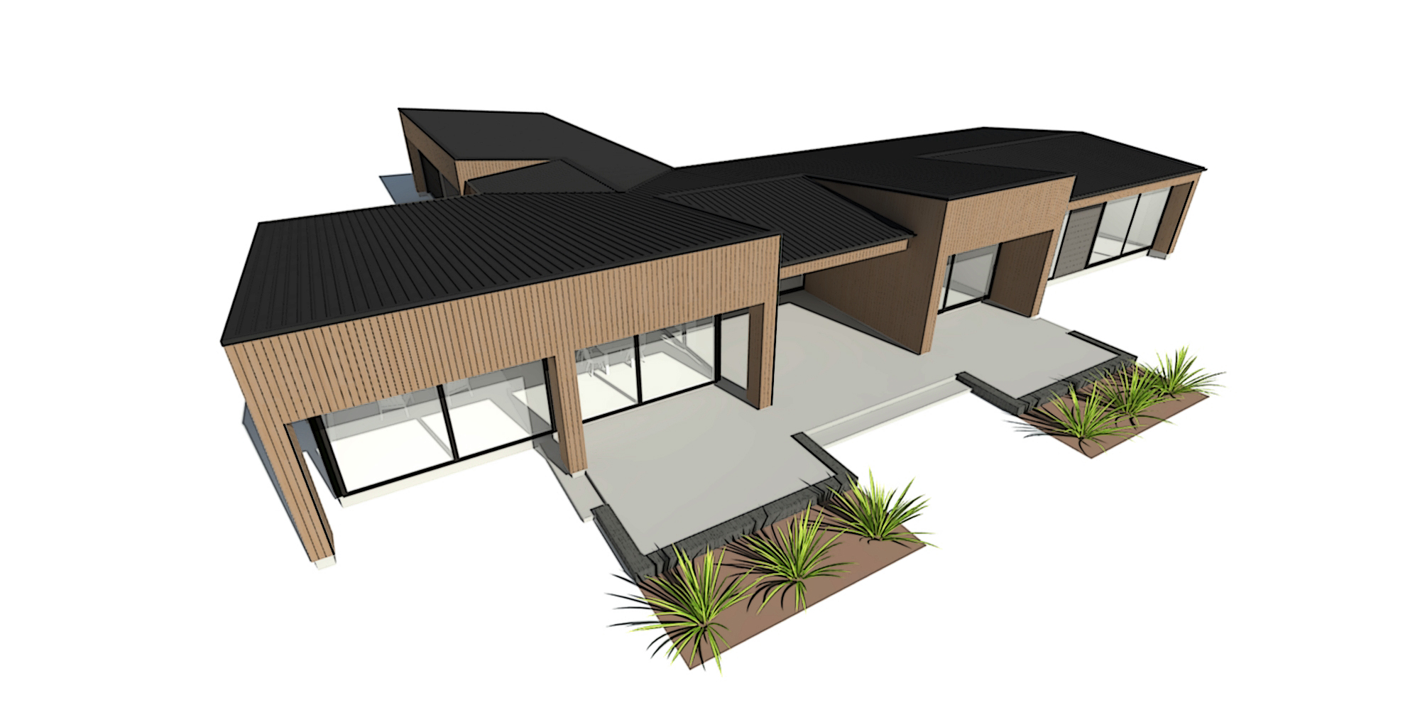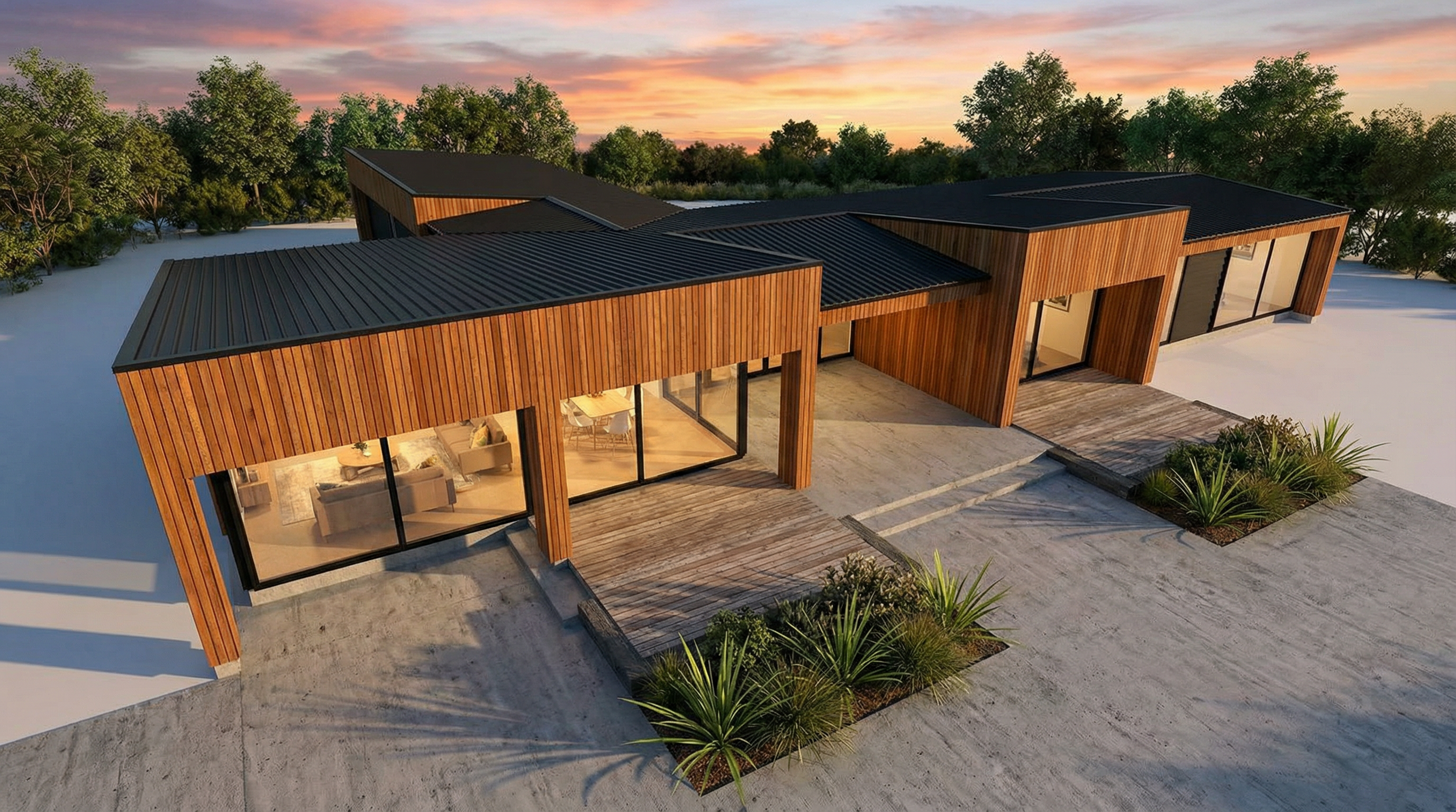 black roof black painted cladding black window frames interior lights on low timber deck concrete paving trees in background extensive native planting sunset
