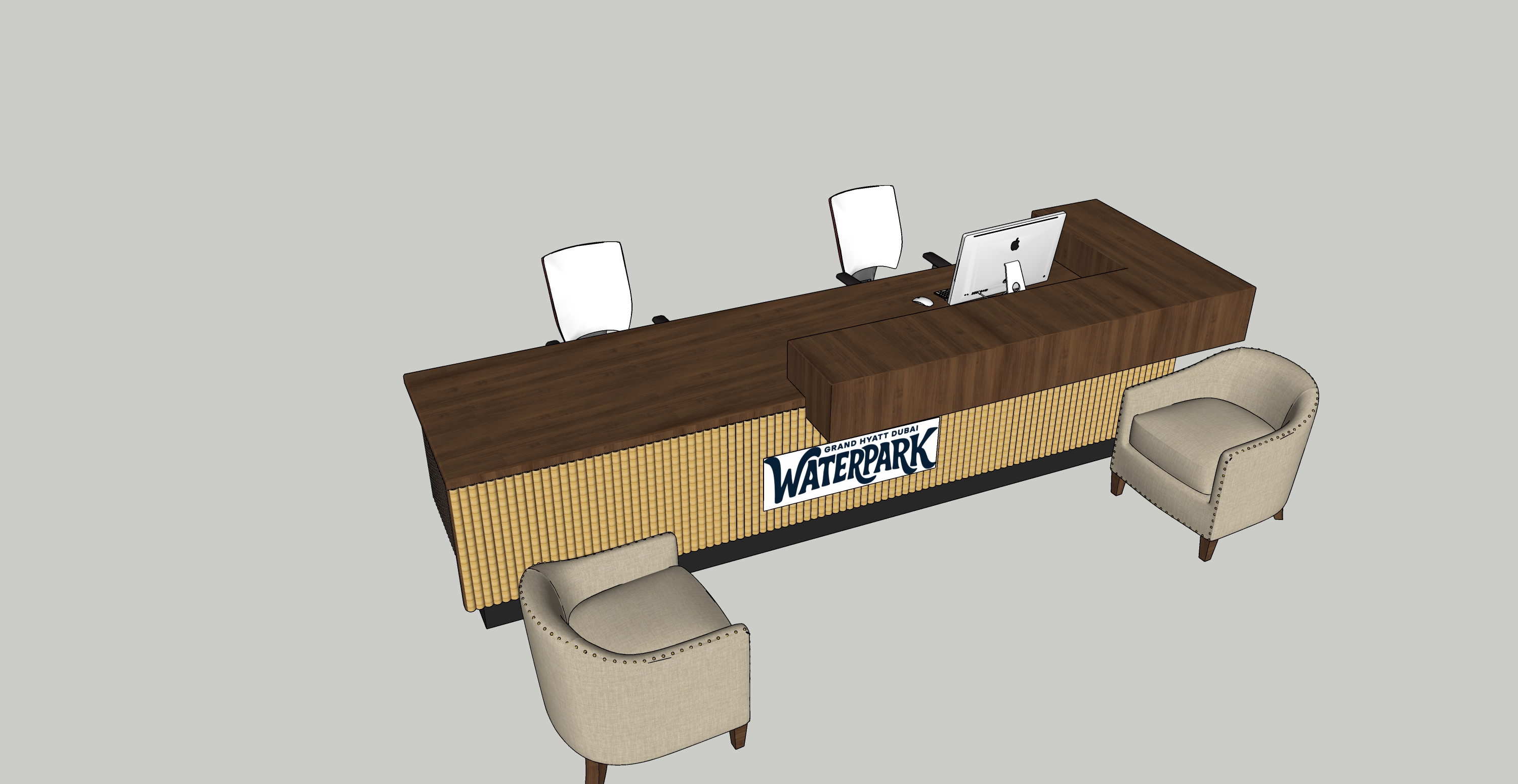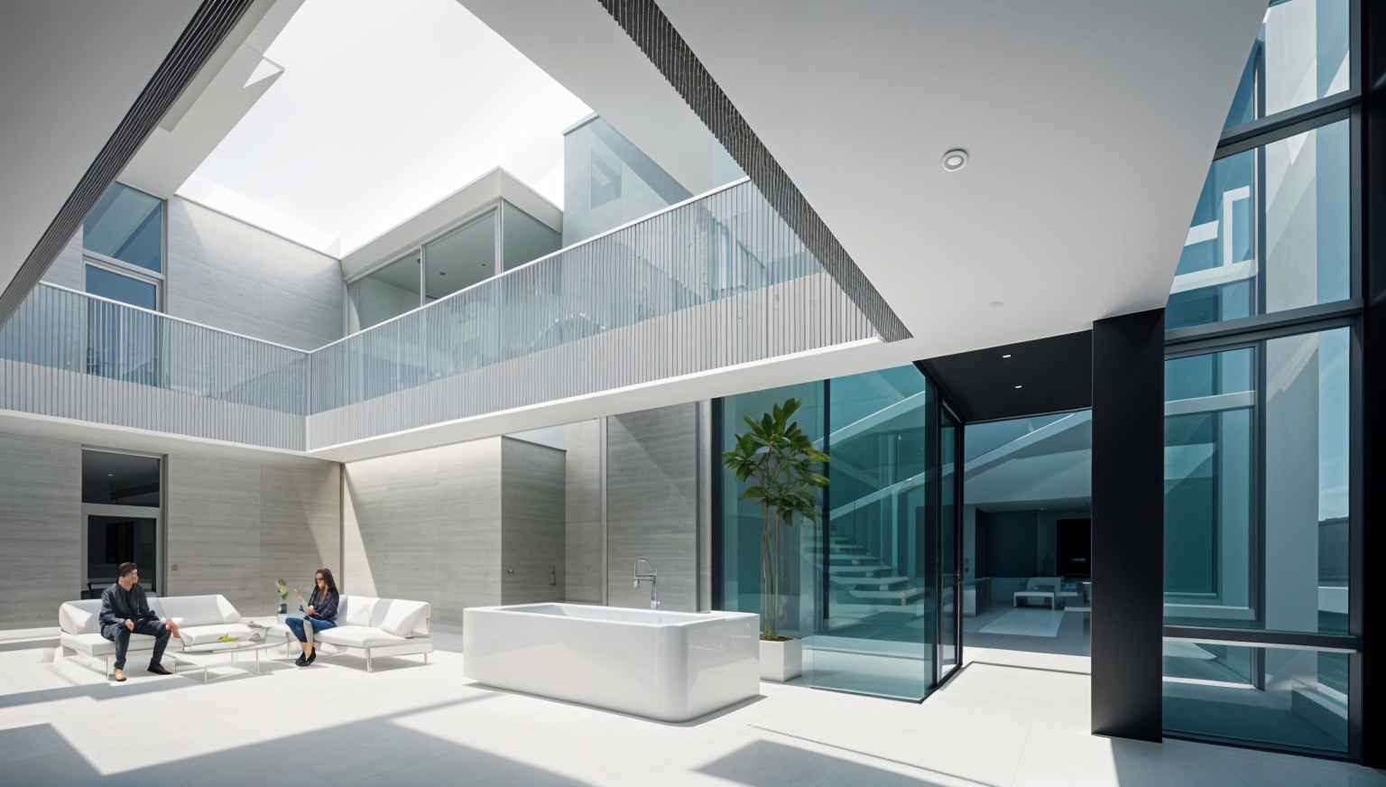 a modern office reception area with a polished wooden desk and two elegant curved black armchairs with cream cushions the desk features a vibrant blue panel with dynamic white line patterns the floor is adorned with ivory colored geometric tiles adding a sophisticated touch soft natural light filters through etched glass windows casting gentle shadows and creating a warm inviting atmosphere decorative plants outside the window bring a hint of greenery enhancing the serene and welcoming environment
