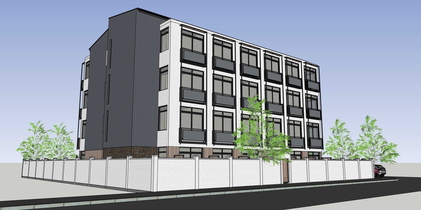 modern apartment building with bolt on metal balconies the fa ade features grey standing seam metal cladding and light render with large aluminium windows the roof is dark gray offering a contemporary touch the surrounding landscape is suburban with vibrant greenery of the lush trees and well maintained grass in light green shades the atmosphere is bright and welcoming with soft natural lighting highlighting with some clouds in the sky a few people walk casually along the sidewalk and a modern car passes nearby complementing the urban setting