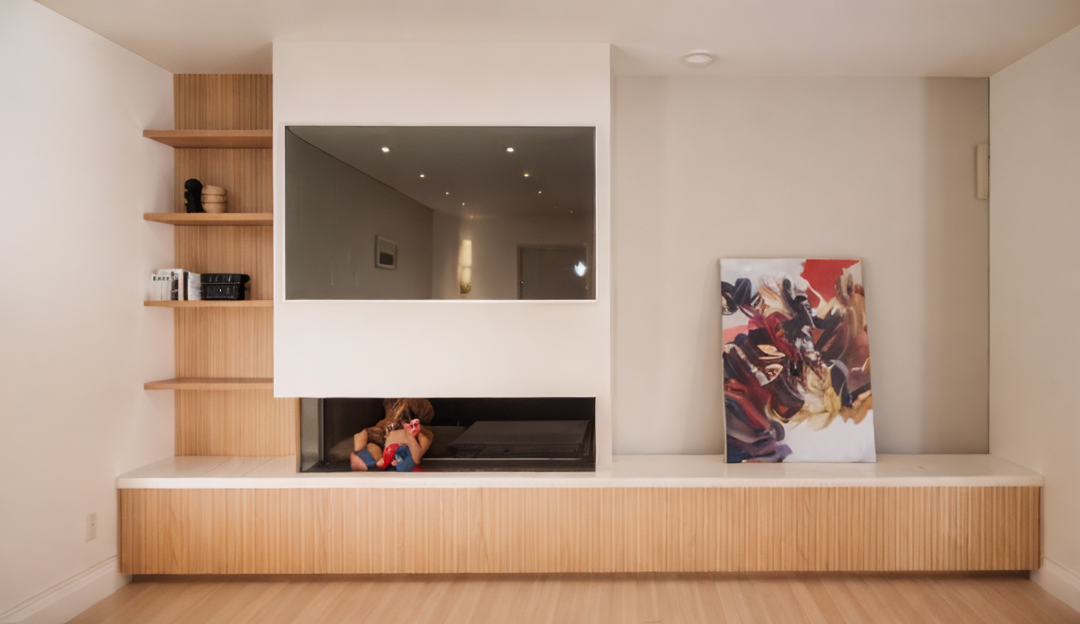 interior of a modern gym with a minimalist design featuring a warm and inviting atmosphere light oak wooden flooring and columns provide a natural feel the ceiling has a grid design with soft beige panels and brass light fixtures emanating a warm glow tall windows on the left allow natural light casting soft shadows the gym equipment is sleek and black arranged neatly against a deep green accent wall adorned with subtle patterns a large wall artwork in muted tones adds an artistic element the overall color palette is neutral with earthy tones enhancing the calm motivational vibe