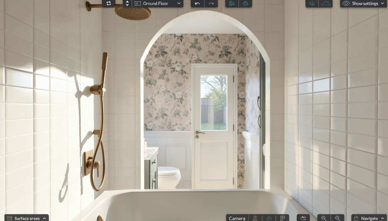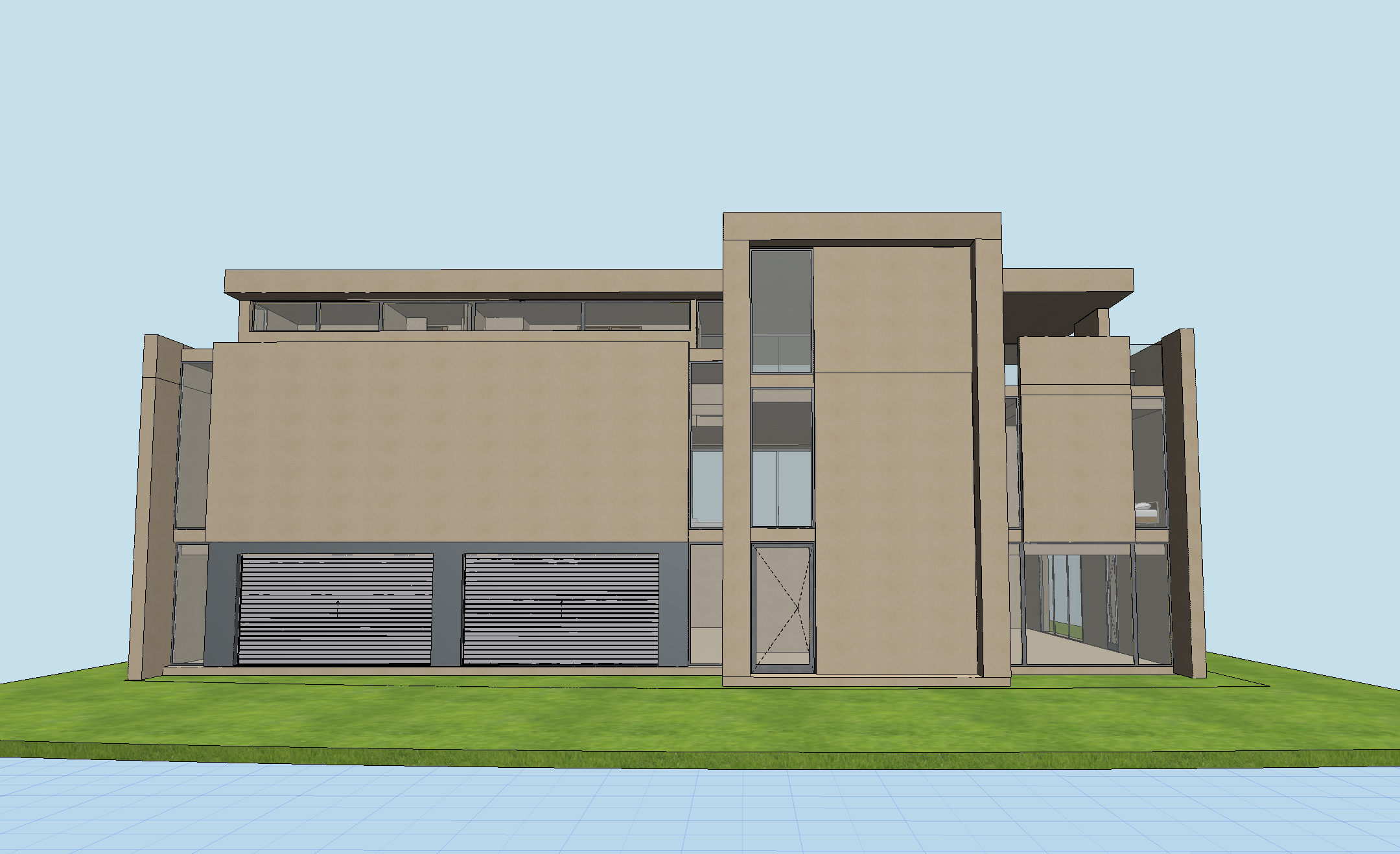 exterior shot use this reference photo for materials but keep all elements and proportions exactly as shown in the model add in a driveway leading toward the garage doors and a walkway toward the front pivot door located in the central circulation core add a palm tree to the right of the front door