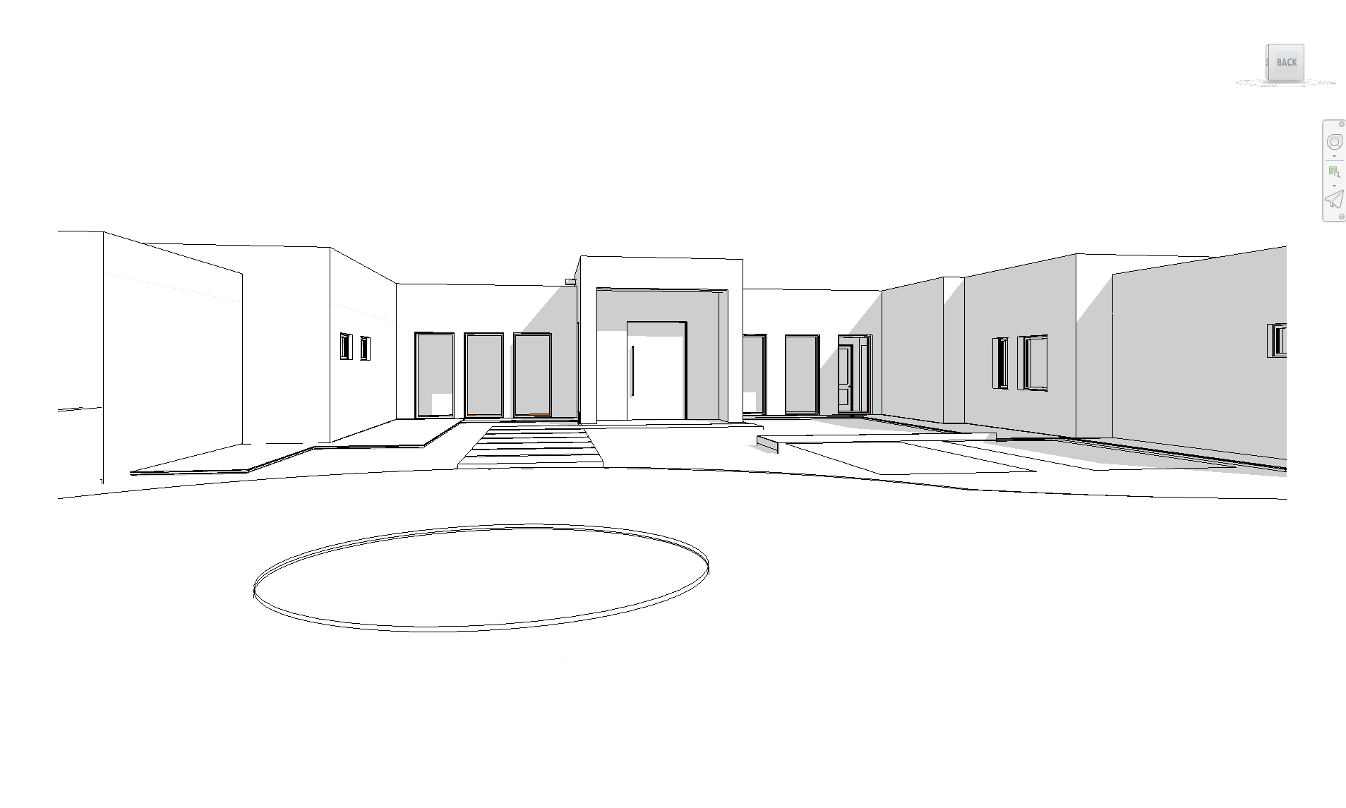 modernist night shot medium brown stucco walls frameless glass wood entry door in black tile entry cube porphry pavers driveway with luscious landscaping architecture