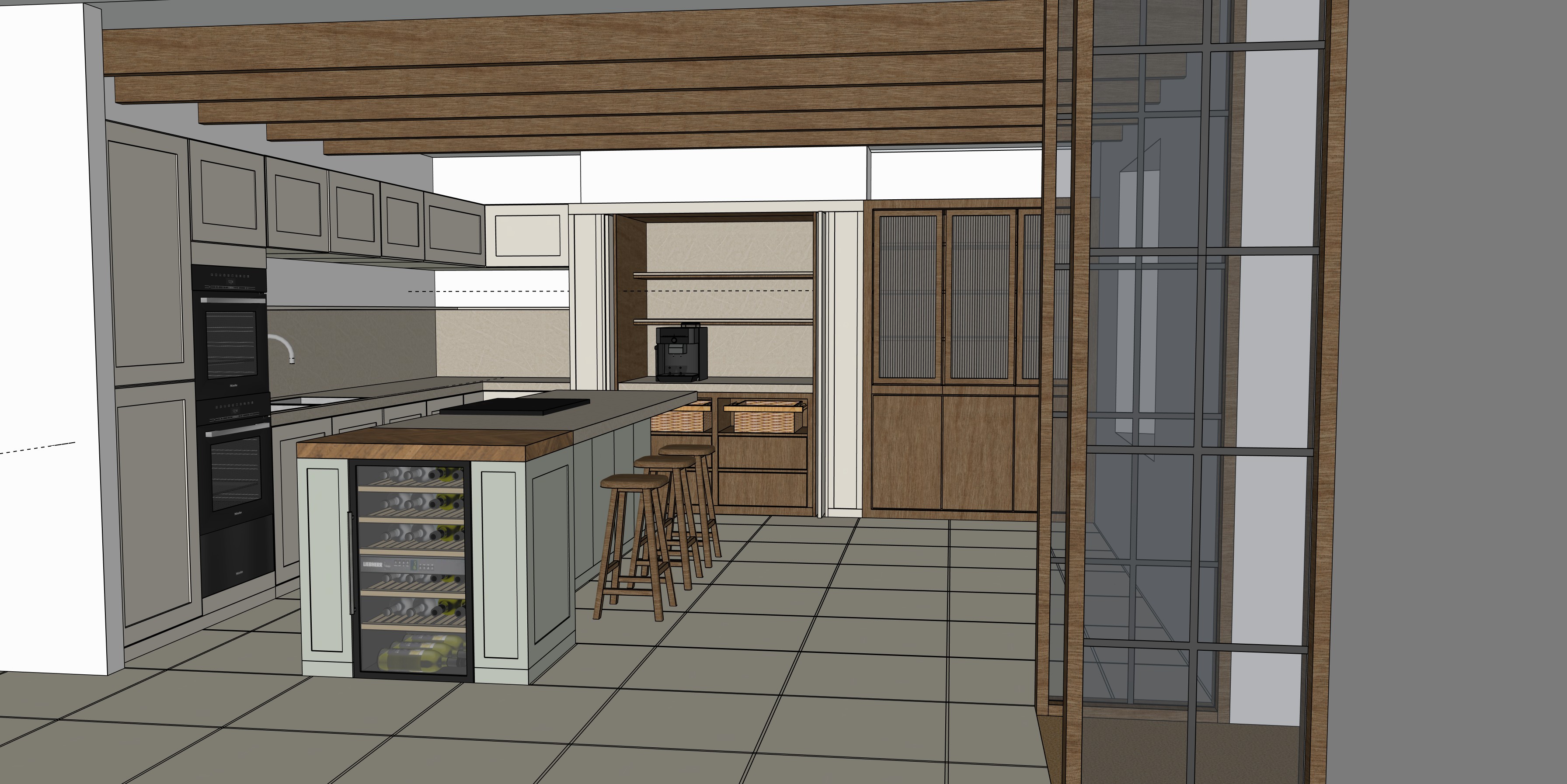 add an eight person dining table to the right hand side space on the image don t show actual people add x3 glass pendant lights above dining table add pantry items to centre unit to the rear of image add x3 glass pendant lights above kitchen island change nothing else within image