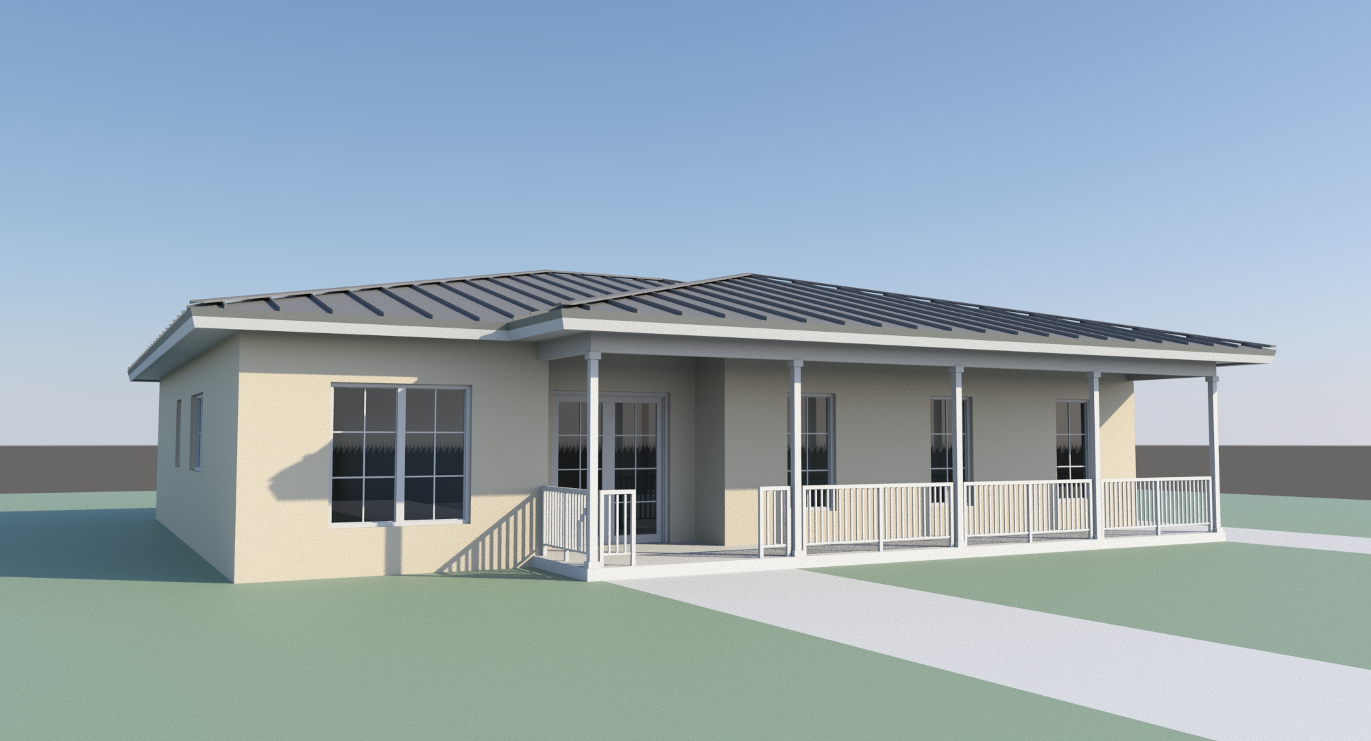 standing seam metal roof white columns and railings lush tropical landscape colorful bushes and shrubbery add clouds in the sky add furniture in the porch