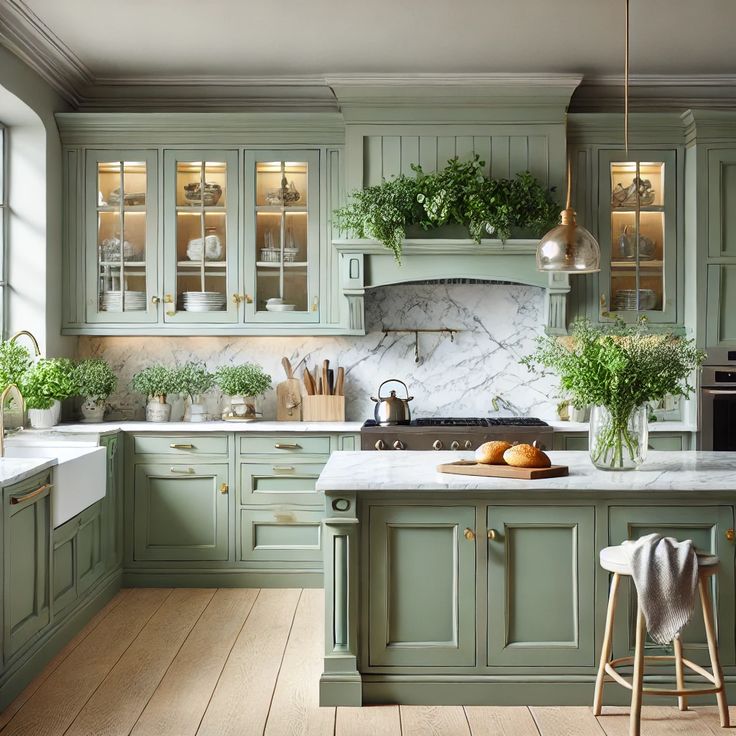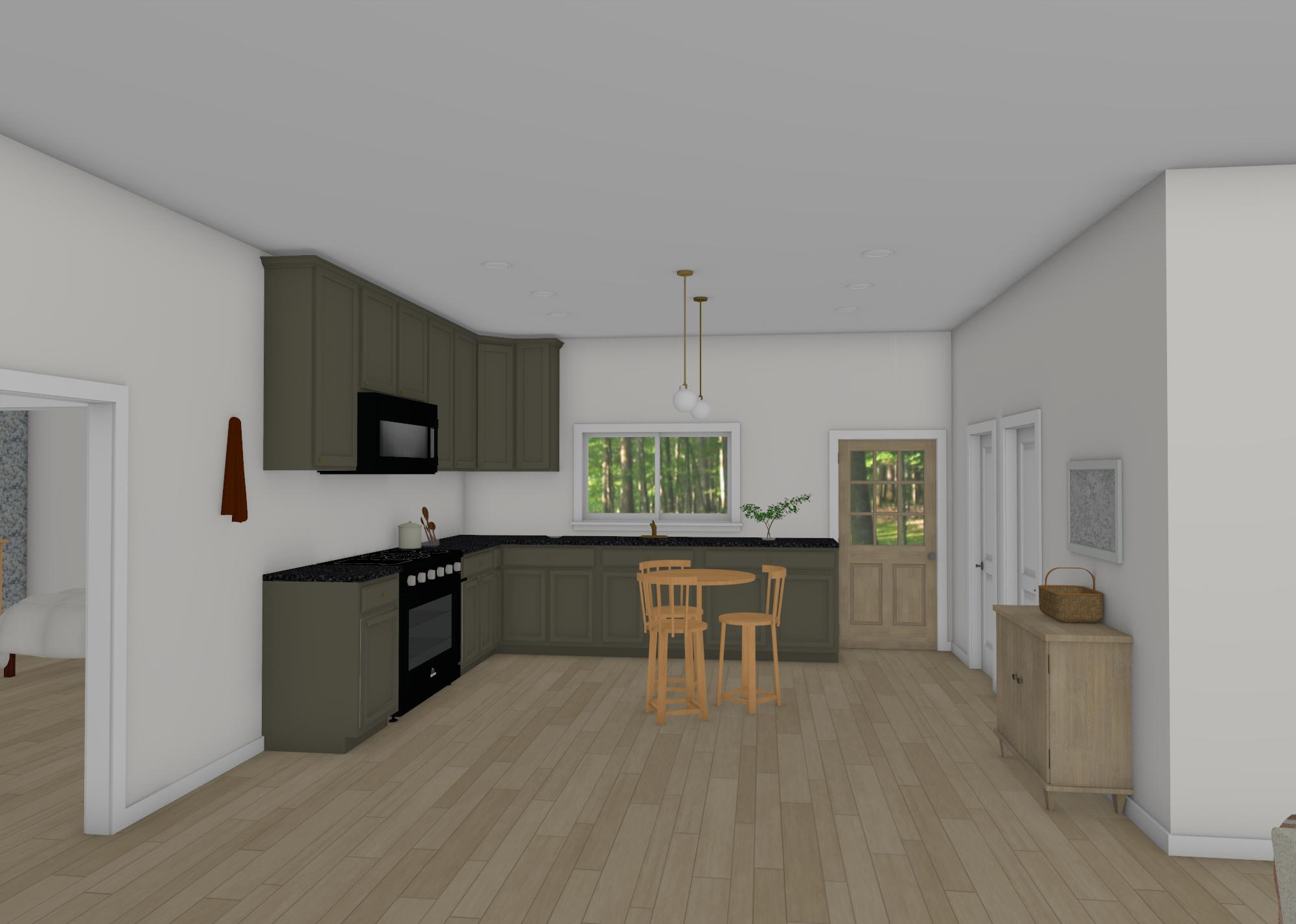 exterior shot create a cozy modern kitchen interior with a warm and inviting atmosphere use olive green for the cabinets paired with sleek black countertops for contrast the kitchen features a hardwood floor in a soft light oak tone a light grey wall serves as a neutral backdrop include a wooden dining table with matching chairs in a natural oak finish above hang pendant lights with brass fixtures and frosted glass shades add subtle touches of greenery on the counter for a fresh feel the overall lighting is warm and inviting creating a homely comfortable ambiance