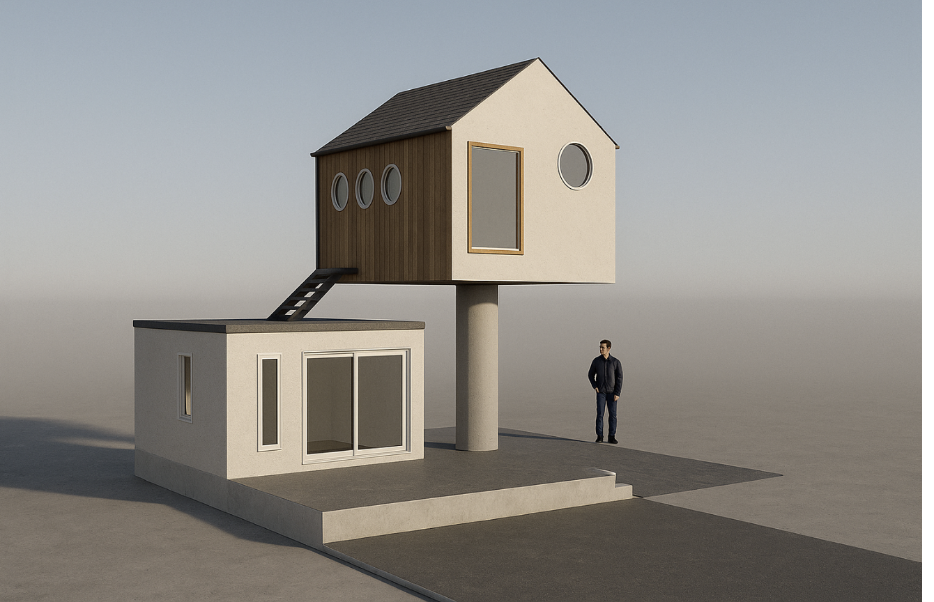 futuristic minimalist house design with a rectangular base and elevated cubic structure the base is crisp white with large glass sliding doors the elevated section is a mix of off white with vertical wooden paneling in warm brown tones windows are round with metallic rims the roof is a sleek dark gray the setting is a vast serene open space under a clear blue sky basking in soft golden twilight a solitary figure stands nearby providing scale and presence the overall atmosphere is calm modern and slightly surreal