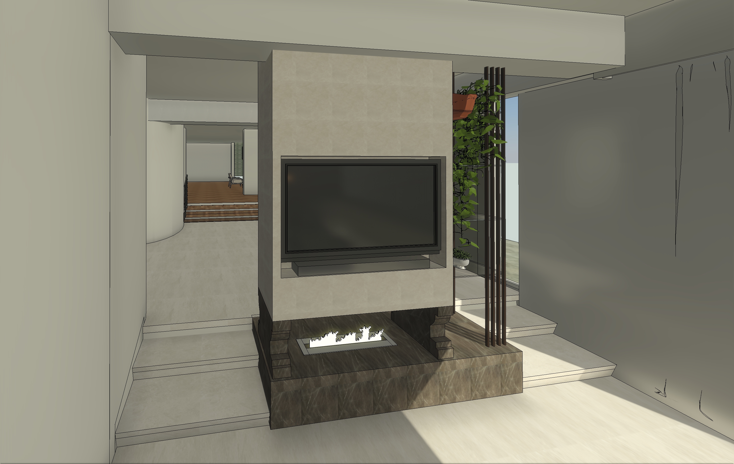 a grand central fire place and tv unit positions with stairs to either side the floor is a light beige travertine marble the upper portion of the tv unit is a rendered venetian plaster and the base unit the fire place sits with in the armani grey marble ther are lush hanging plants on the shelves on the left