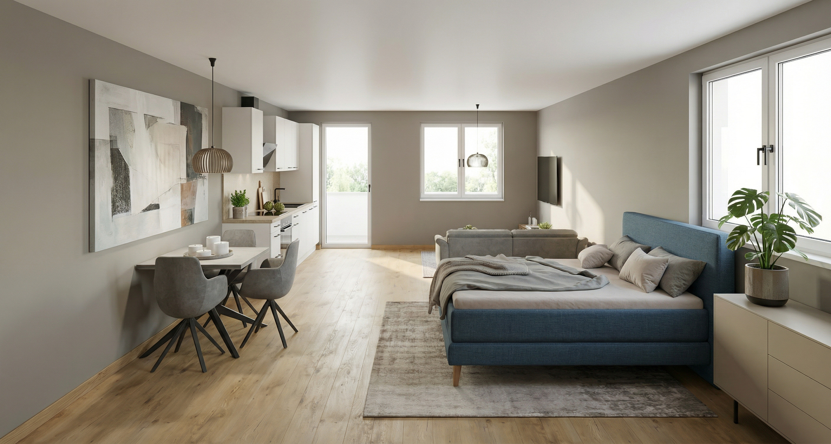 bitte nur das fenster rechts entfernen und das sideboard nebem dem bett enfernen mach das bett ordentlich und lege noch eine tagesdecke locker dar ber alles andere genauso lassen