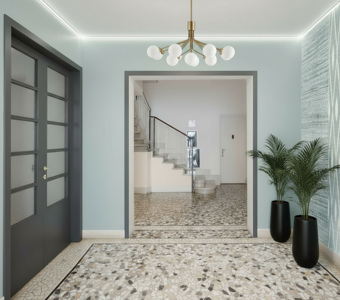 peindre en anthracite l encadrement et les murs du creux dans l ouverture centrale peindre en blanc les murs au fond de l image dans la piece de l escalier agrandir un peu les deux vases avec palmiers les deplacer le long du mur de droite ver l avant de l image