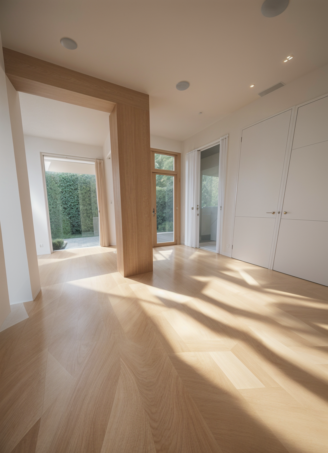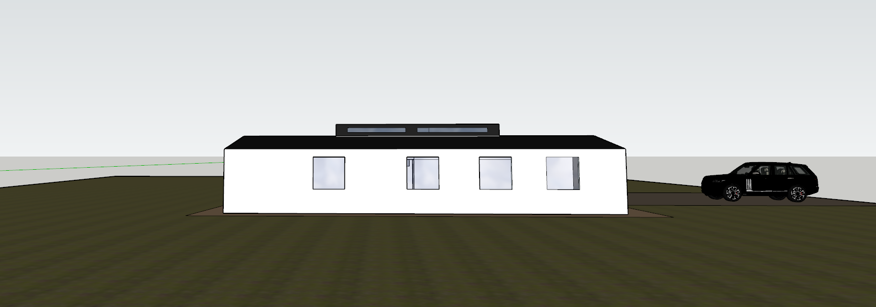 render a modern house with a sleek minimalist design the house has a white facade and a black flat roof large glass windows reflect the ambient light a black suv is parked on a paved driveway surround the scene with lush green grass and soft brown soil the sky is a gradient of light gray to white creating an overcast atmosphere casting soft diffused lighting over the scene highlight the contrast between the sharp lines of the building and the natural curves of the landscape