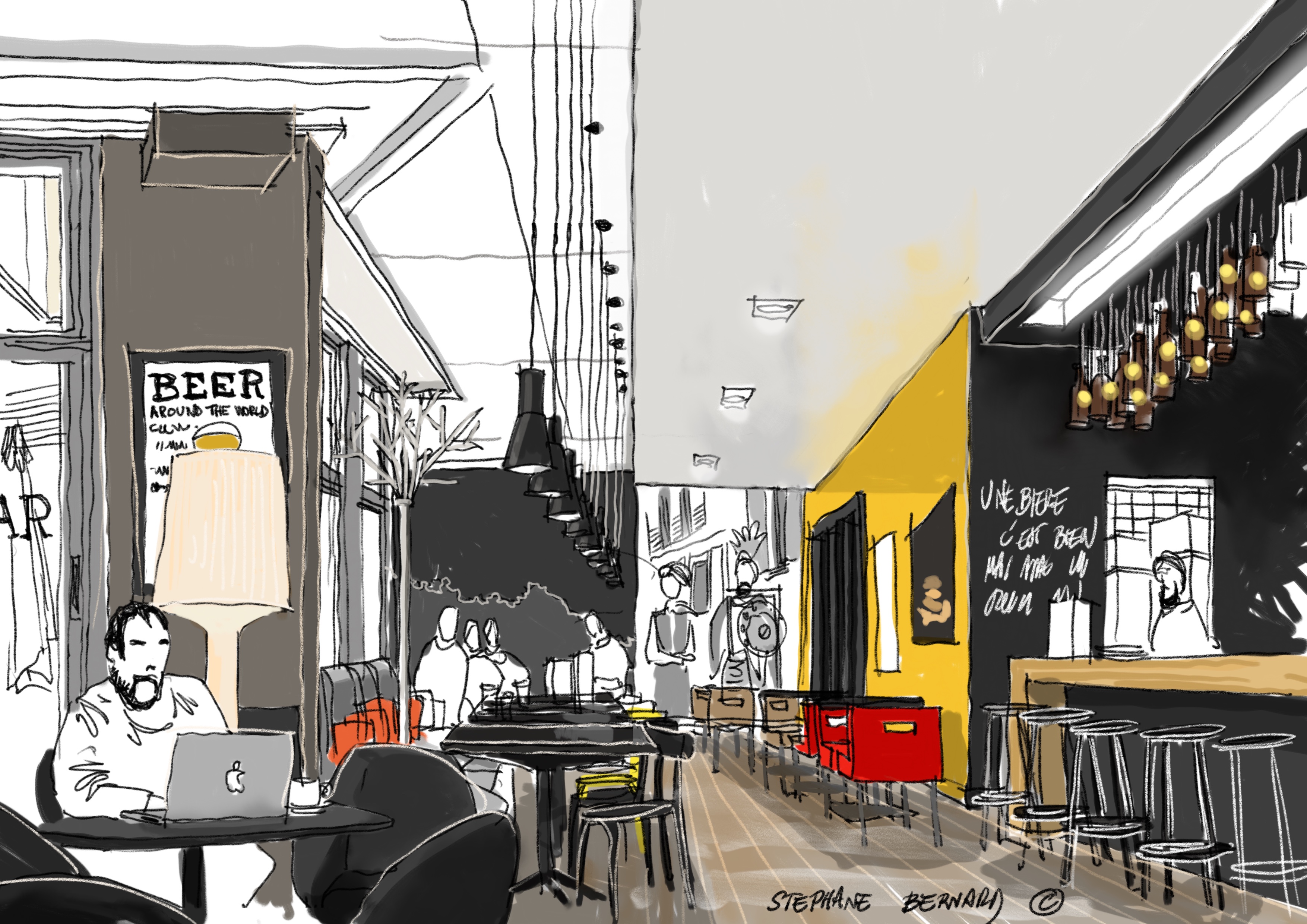 contemporary caf interior warm and lively atmosphere based on a hand drawn architectural sketch maintain the exact perspective and composition natural wood floor black and yellow accent walls minimalist industrial design long bar counter on the right with high stools warm pendant lights hanging in a row creating a soft golden glow people sitting and working relaxed social interaction one person using a laptop in the foreground add realistic depth soft shadows and subtle reflections enhance materials matte black surfaces warm wood textures soft fabric seating outside light coming from the back opening with natural greenery visible atmosphere cozy elegant slightly artistic like an architecture magazine realistic human figures natural faces candid poses balanced lighting cinematic but soft high end interior photography style
