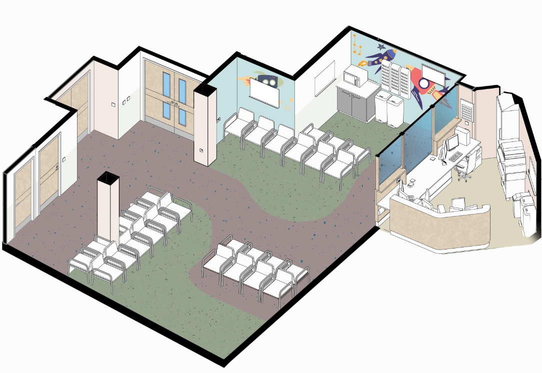 interior from the top a modern office floor plan rendered in a detailed isometric view the main room features a conference area with white chairs and a speckled light grey blue carpet walls are a soothing light blue with abstract space themed wall decals in orange and navy creating a playful yet professional atmosphere the adjacent office area contains a minimalist white desk grey filing cabinets and large glass windows that overlook a lush green landscape casting natural light across the room the reception area has a curved beige counter with sleek modern design the overall ambiance is bright airy and welcoming with a harmonious balance of colors that evoke creativity and tranquility architecture