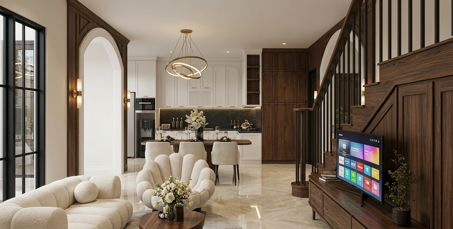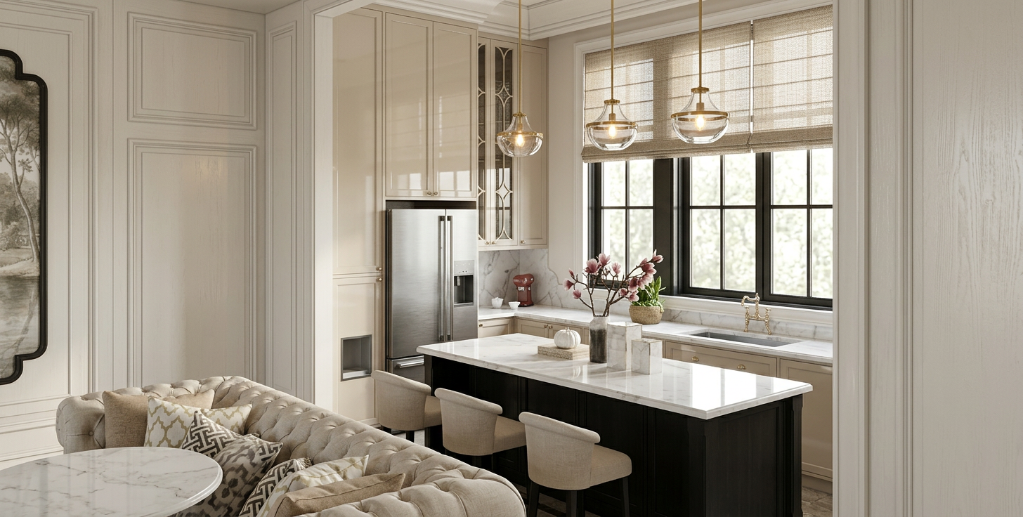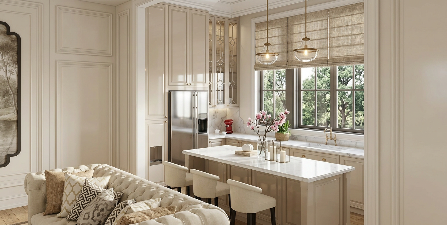 create an ultra realistic image without changing any of the structure shape design or materials don t resize the jpeg use a glossy light beige white marble top table kitchen and island warm off white wall