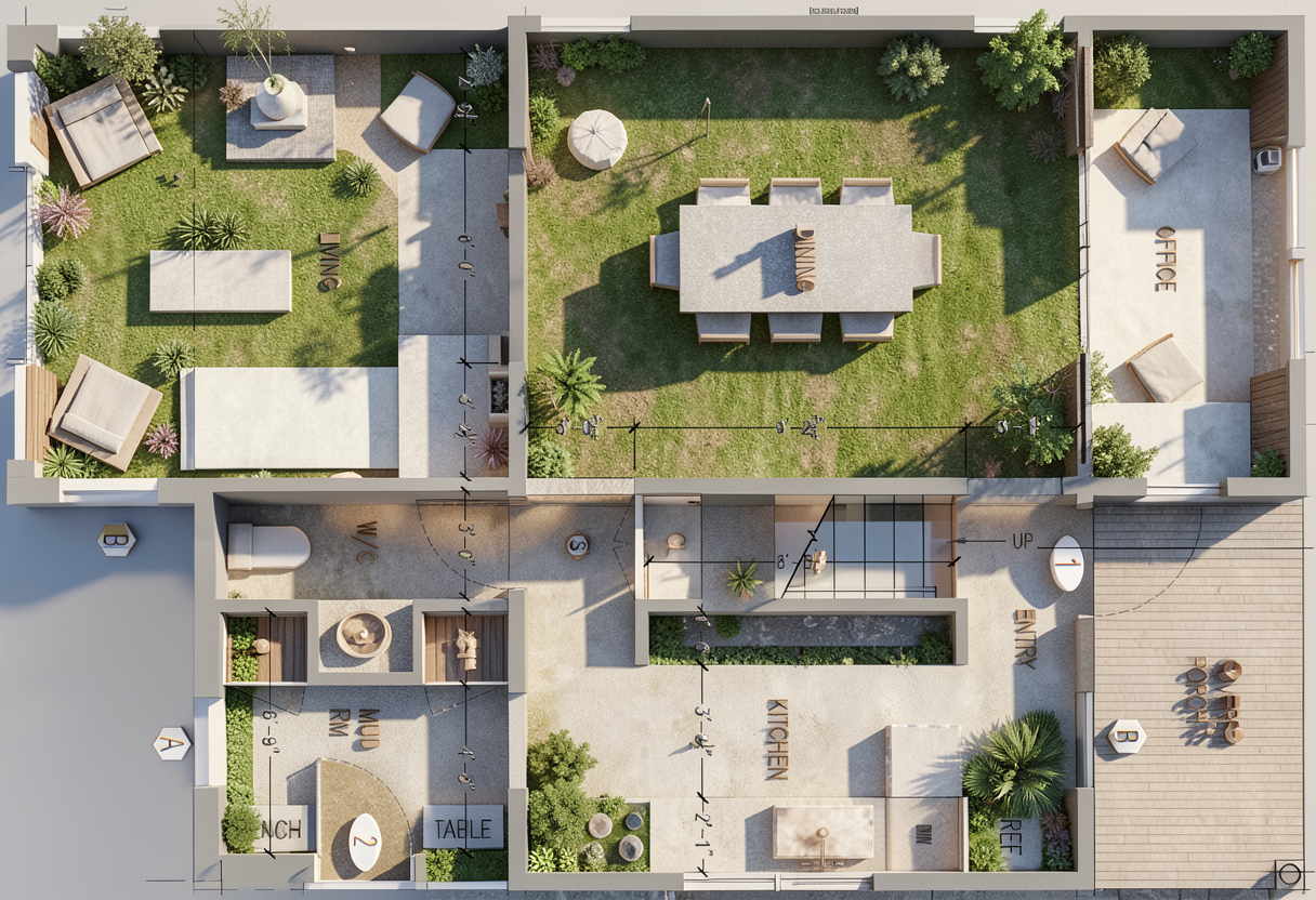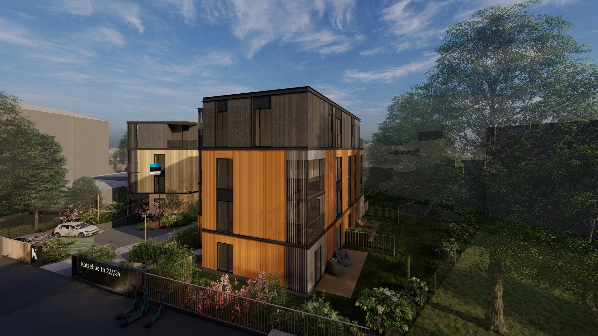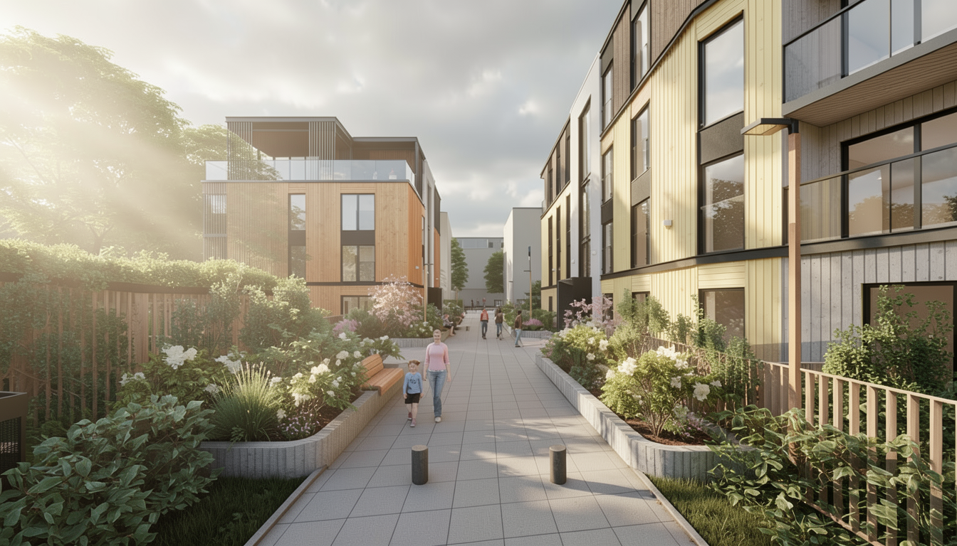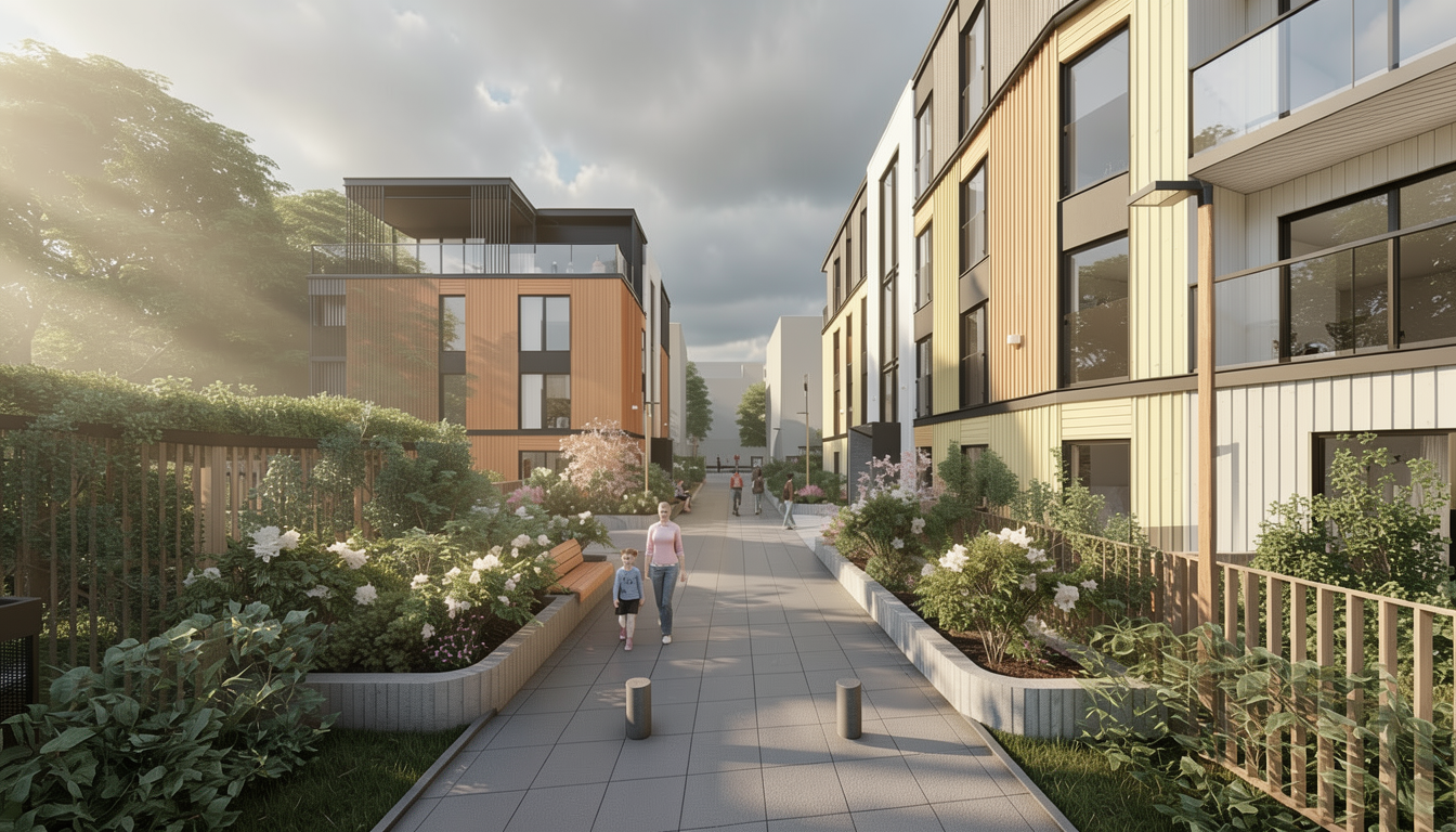 photorealistic architectural photograph captured at 2 pm on a cloudy day sunlight beams from the right side soft lighting keep the massing and facade materials layout keep the original facade material placement and color palette keep the saturation of the orange and yellow colors the vegetation is nordic garden style keep the amount and massing of the vegetation dont add extra vegetation