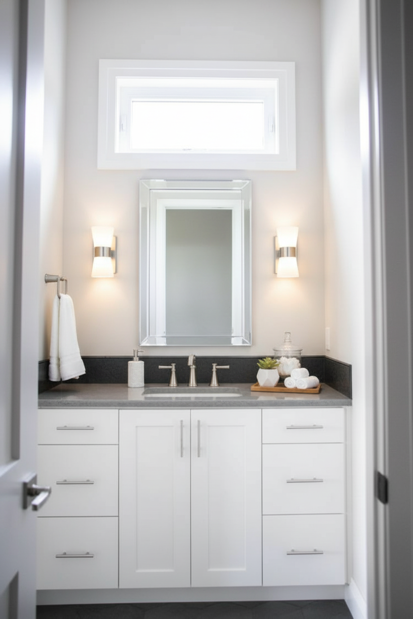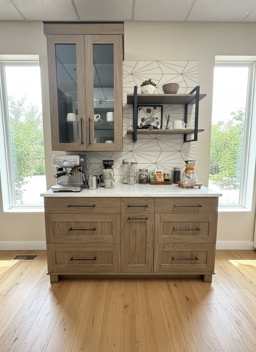 warm modern renovation of the provided room without changing layout or openings replace all cabinets with matte white full overlay shaker 3 rails stiles and matte black linear pulls install warm light medium gray quartz counters with subtle veining and quartz only where backsplash exists add counter depth stainless refrigerator at the left end with uppers above add a small stainless range to the right of the sink with a simple stainless hood and short shaker cabinet above repair ceiling add 4 white trim recessed lights at current holes and replace fan with a modern matte black fan with small integrated light install continuous warm white oak plank flooring across all visible areas refresh walls to warm white with crisp white trim add a compact two person dining set near the refrigerator left foreground and a small living area on the right light sofa coffee table low media console wall mounted tv preserving clear paths show a neatly made bed visible through the rear doorway remove all debris photoreal materials and accurate stainless reflections
