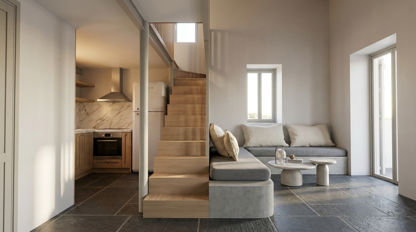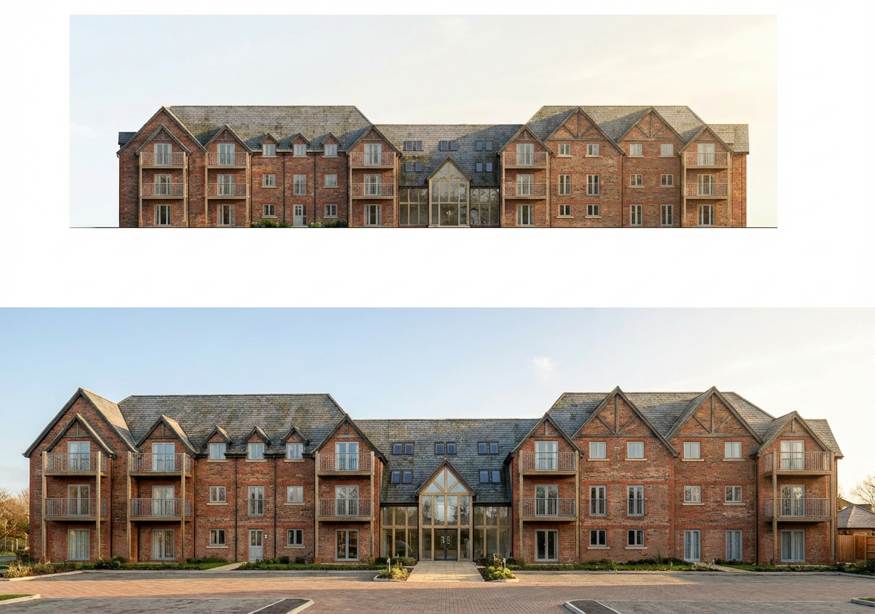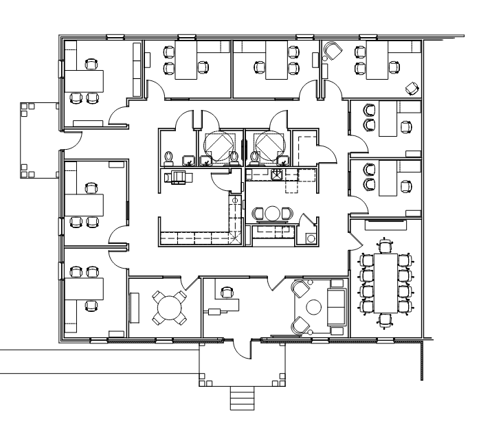 convert this floor plan into a realistic isometric 3d view of a full house show the space from an elevated angle with furniture walls and details visible furniture should be white oak finish with black chairs pops of light blue floor of reception break room and work room is wood tone neutral carpet throughout walls are white glass is clear use the same furniture as shows on the plan do not change the orientation of the floorplan