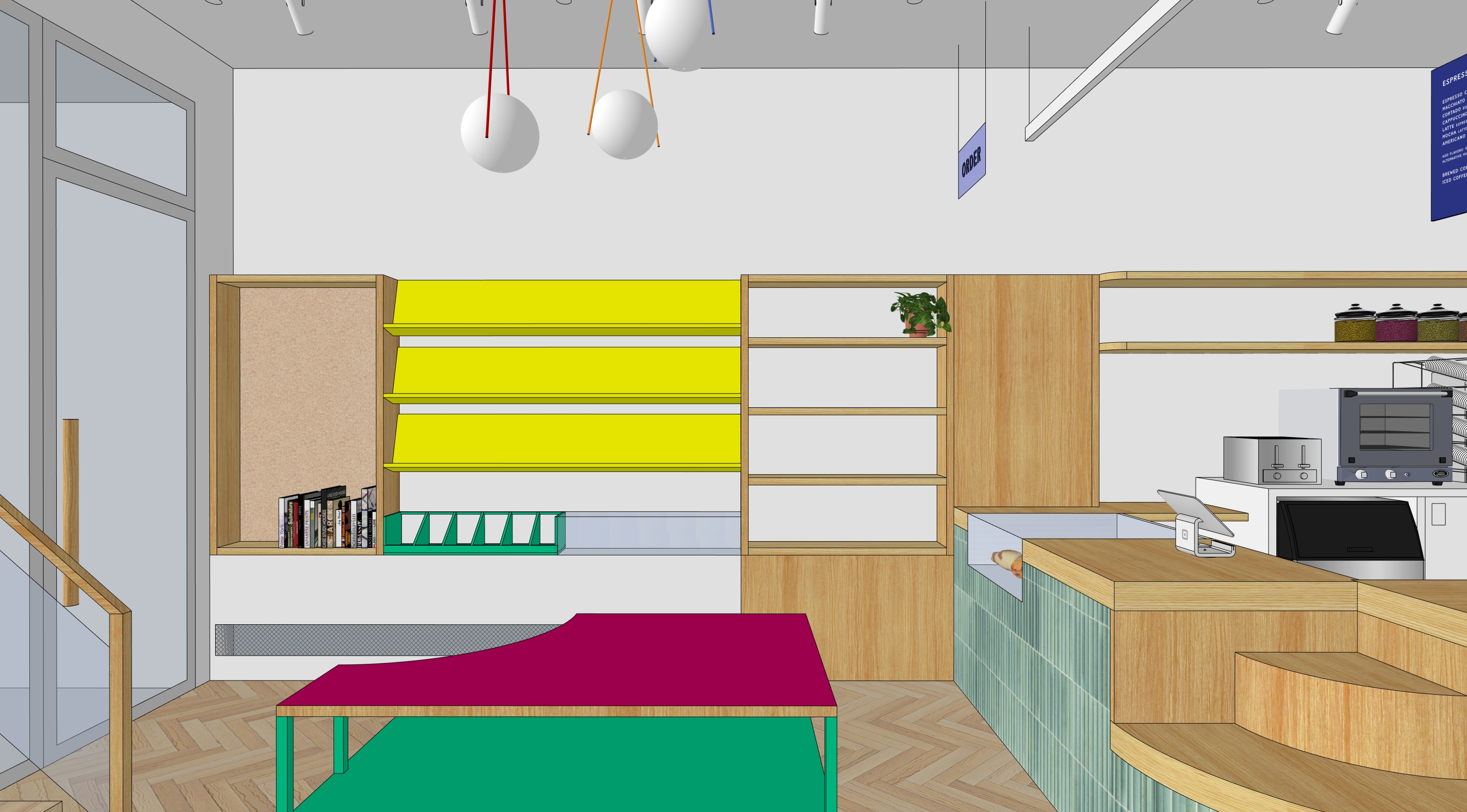 this is an interior view of a coffee shop the ordering counter has tile on its facade and the furniture is oak and jade green powder coated metal there is yellow shelving on the wall the top center of the image has globe lights that have a soft glow the space has soft natural light in it but do not render any surfaces as windows there are no windows in this image the tabletop is thin laminate in a deep coral color