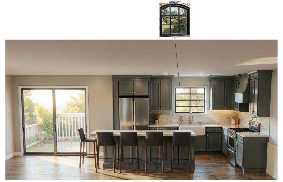keep everything the same do not change color or materials only replace the existing window with the reference window in the image the window with the curved top with the 3 window grids do not change anything else or add anything