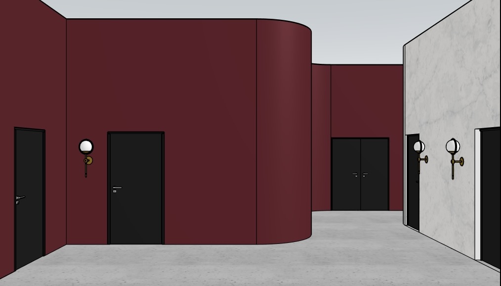 modern interior hallway with an elegant atmosphere deep burgundy walls and curved features create a warm and sophisticated environment smooth ivory marble wall contrasts beautifully with the rich colors complementing the matte black doors bronze wall sconces with glowing round bulbs add soft ambient lighting the concrete floor is subtle and light gray the celling is lighten up by led panel around the door on a left on a front wall are going to female changing room so paint the silhuette of female dancer on the wall next to the door the overall atmosphere is luxurious and serene blending contemporary design with a touch of classic elegance