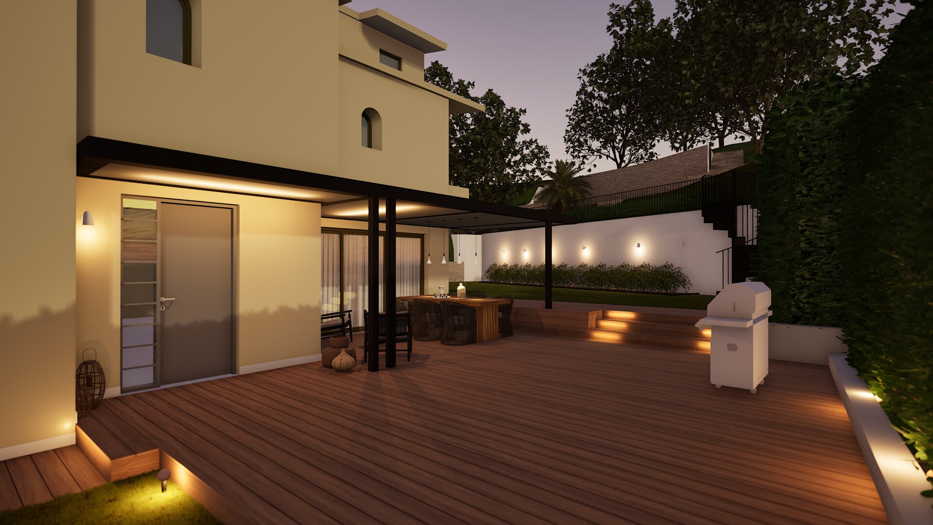 modern backyard patio scene at dusk featuring a two story cream colored house with minimalist architecture the patio is adorned with warm ambient lighting that softly illuminates the space the wooden deck is a rich natural brown complemented by cozy outdoor furniture in dark hues the dining area is highlighted by subtle pendant lights above a wooden table creating an intimate atmosphere lush greenery surrounds the area including neatly trimmed hedges and tall elegant trees in the background the sky is a gentle lavender casting a serene tranquil ambiance over the entire scene