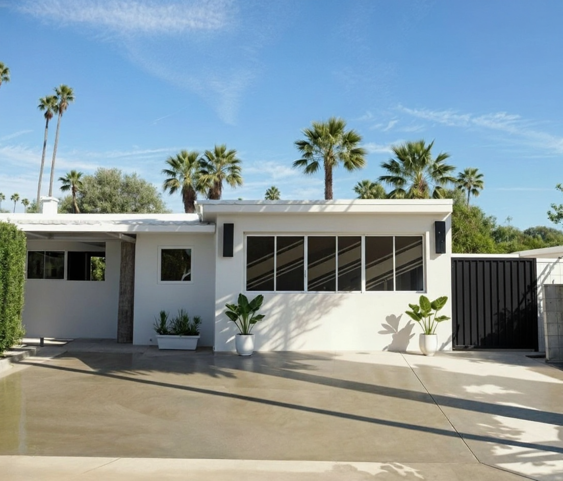 render a luxurious interior space featuring tall elegant drapes in grey beige colour creating a sophisticated and soft atmosphere white plasters on the wall and elegant mirrors and they enlarge optically room the herringbone patterned matte floor enhances the sense of spaciousness minimal greenery and interesting accessories add freshness to the interior while maintaining its minimalist and clean character daylight enters from the left through delicate cashmere curtains in a gray beige shade walls are off white the railings are ornate black wrought iron very delicate adding an artistic flair with a timeless design on the back there are wardrobe with mirrors and plasters and ping pong table the ceiling and remaining walls are light gray maintaining a neutral balance the overall atmosphere is stylish and upscale illuminated by soft ambient lighting crystal barovier tosso wall lighting
