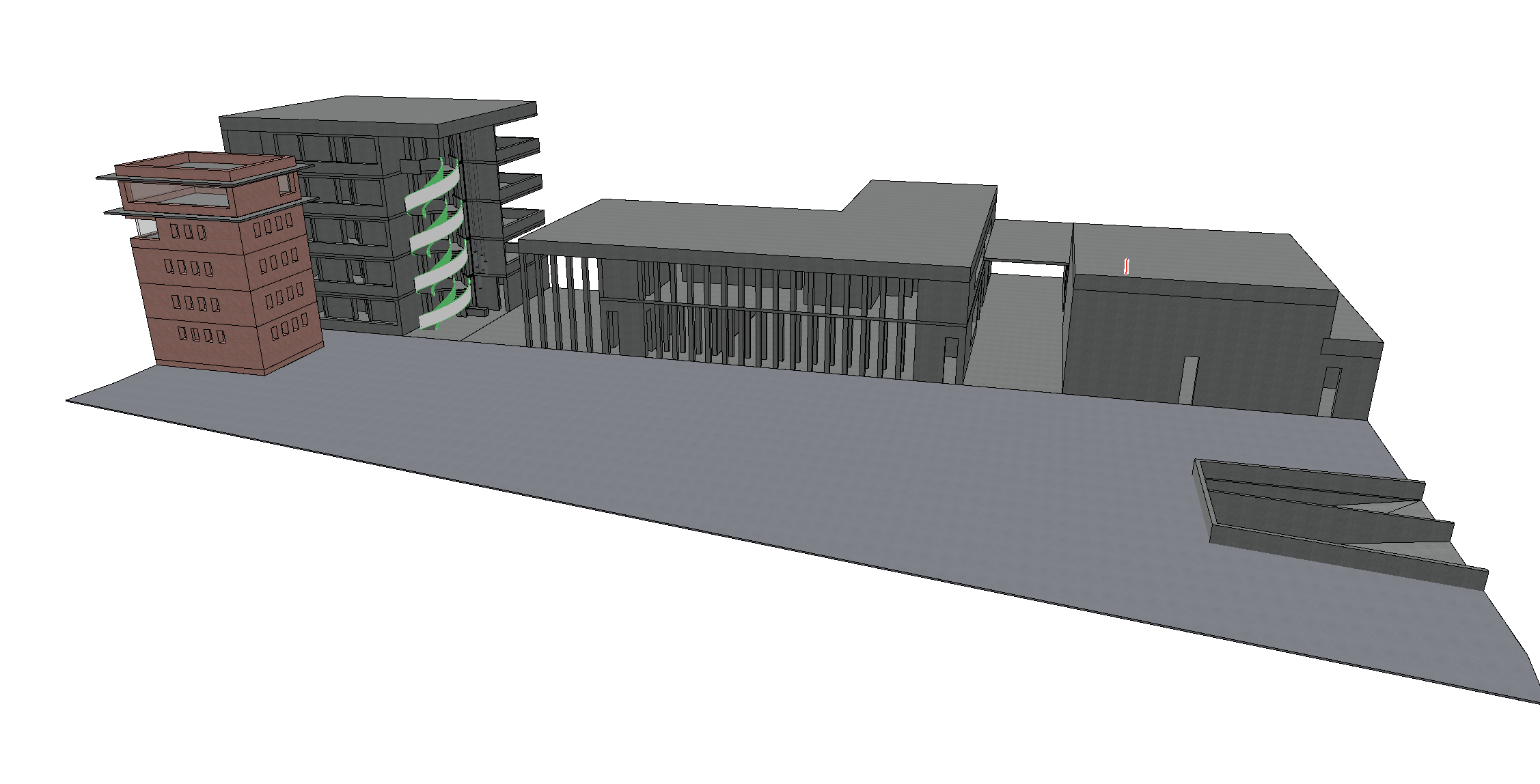 a realistic setting around the inserted buildings showing an open railway landscape with overgrown vegetation tall grasses small shrubs and scattered young trees the scene includes lightly industrial surroundings with a few low industrial buildings in the distance a raised road bridge on the right side and a bright clear sky with soft clouds the atmosphere feels open green and slightly rough shaped by railway terrain and natural vegetation blending into the industrial edges of berlin