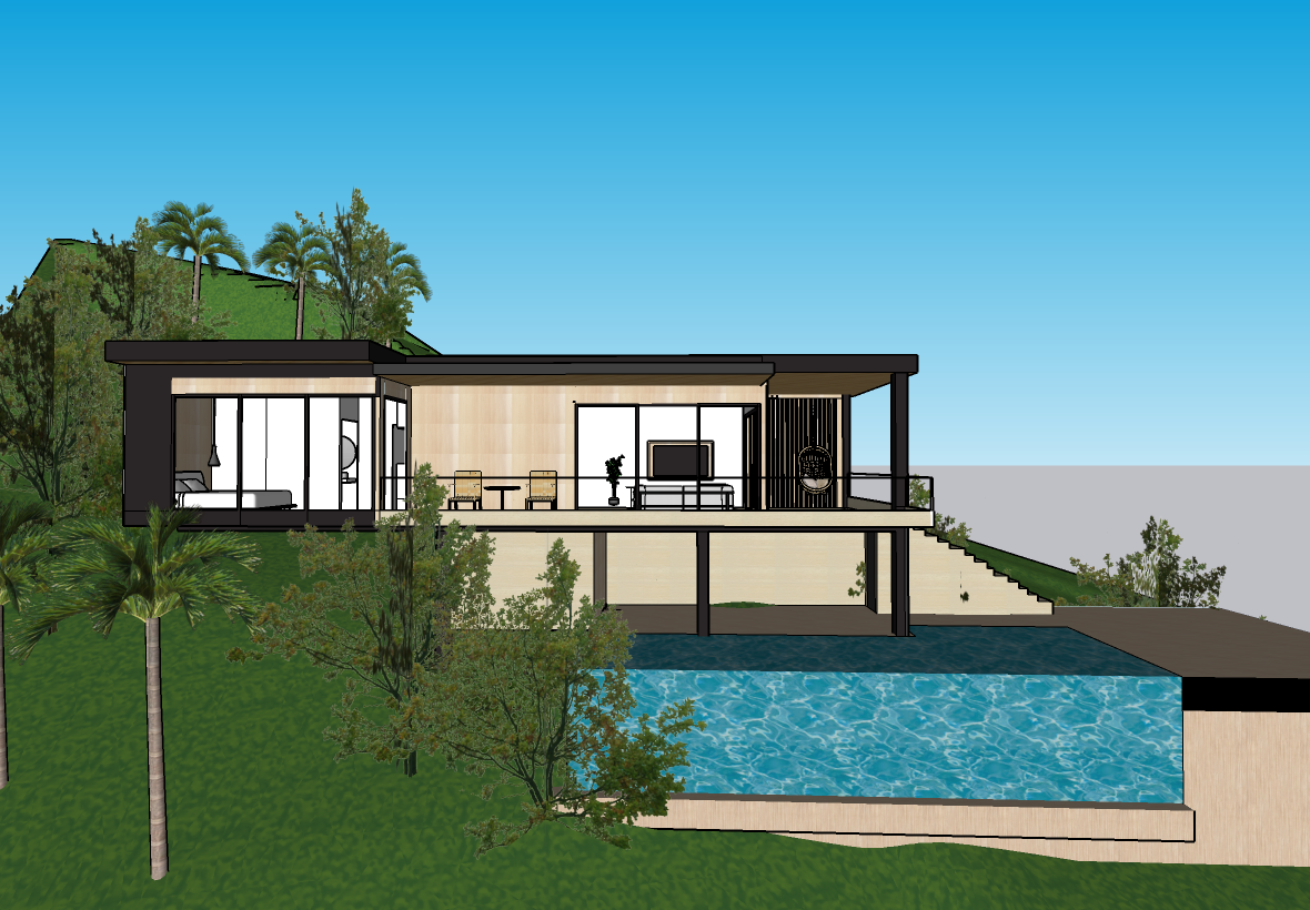 render a modern minimalist house on a hillside with a bright blue sky the house features wooden paneling in light beige and sleek black accents the large glass windows reflect the natural light creating a warm inviting atmosphere the staircase is a soft ivory color seamlessly integrating with the surrounding greenery add lush green grass and a variety of trees for a vibrant serene landscape with a hint of turquoise from a nearby water feature set the atmosphere to be peaceful and summer like with natural light enhancing the overall tranquility