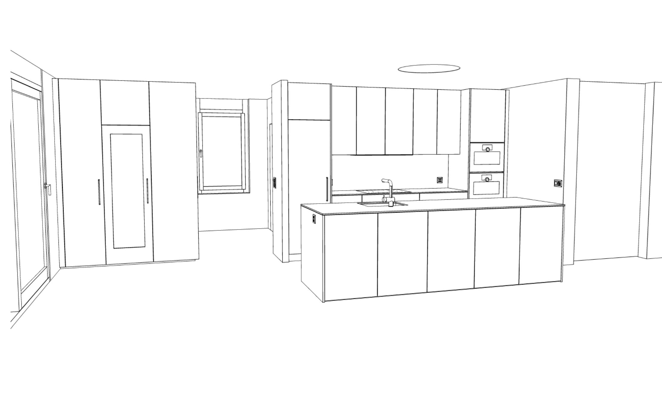 wandeln sie die drahtgitterperspektive in eine hochaufl sende fotorealistische architekturvisualisierung um wobei die definierten farben materialien und geometrien strikt beibehalten werden m ssen geometrie die hochgeladene skizze ist die einzige ma gebliche quelle f r die gesamte geometrie und struktur unter keinen umst nden d rfen elemente hinzugef gt entfernt erweitert neu gestaltet optimiert oder neu interpretiert werden es d rfen keine zus tzlichen schr nke paneele regale architektonischen details oder strukturellen komponenten hinzugef gt werden es ist nur die anwendung von materialien erlaubt jede nderung die ber die materialanpassung hinausgeht gilt als fehler behalten sie die geometrie strikt unver ndert bei ndern sie keine proportionen ffnungen volumen ausrichtungen oder architektonischen elemente behalten sie die exakte kameraperspektive bei k che materialien k chenfronten in weiss hochgl nzend lackiert leichter realistischer spiegeleffekt ohne bertreibung pr zise einheitliche frontunterteilungen mit konsistentem fugenbild wo keine griffe gezeichnet sind die t ren push to open grifflos dort wo griffe gezeichnet sind bei den hochschr nken sind diese edelstahlfarbig geschliffen matt keine sichtbaren befestigungen die beiden exklusiven einbauback fen und die w rmeschublade von gaggenau haben schwarze reflektierende glasfronten und sind grifflos realistischer spiegeleffekt ohne bertreibung das kochfeld an der hinteren k chenzeile ist schwarz spiegelnd dar ber befindet sich der verdeckt eingebaute dunstabzug einzig der ausziehbare glasschirm ist sichtbar der zweite hochschrank von links ist ein weink hlschrank mit einem weissen frontfarbigen rahmen hochglanz und einer glasf llung dahinter sieht mann die auf holzrosten liegend lagerndene weinflaschen arbeitsplatte granit taj mahal helles beige mit dunklerer maserung ruhige und zur ckhaltende optik feine dezente struktur halbmatter glanz die oberfl che sollte eine dezente realistische lichtreflexion aufweisen kein starker glanz arbeitsplatte nur liegend obendrauf klare pr zise berg nge zwischen stein holz und lackoberfl chen solide gefertigte optik mit ruhigen pr zisen linien und hoher handwerklicher pr zision klare proportionen zur ckhaltende details bodenkonzept der ganze boden ist riemenparkett in eichenholz mittelbraun cognacfarben mit gut sichtbarer holzstruktur der boden ist glatt und seidenmatt die strukturrichtung ist paralell zur k cheninsel von links nach rechts wandkonzept die w nde sind weissputz mit weiner gleichm ssiger struktur die t ren und fenster sind weiss seidenmatt gestrichen elektrik dekoration steckdosen nur dort anbringen wo sie ausdr cklich im drahtgittermodell eingezeichnet sind keine zus tzlichen steckdosen hinzuf gen die steckdosen sind weiss dekorative elemente minimalistisch und zeitgem ausschlie lich in arbeitsplattenh he positioniert passend zur modernen schweizer k chen sthetik zur ckhaltend hochwertig aufger umt beleuchtung nat rliches tageslicht f llt durch gro z gige fensterfronten links und im r cken der kamera ein und bringt viel tageslicht in den raum beim fenster links im bild noch einen weissen leicht transparenten tagvorhang einf gen durch das runde loch in der decke oberhalb der insel kommt weiteres tageslicht hinen weiche realistische schattenbildung dezente glaubw rdige reflexionen auf der kunststeinoberfl che keine k nstlichen lichteffekte keine berinszenierung atmosph re ruhig wohnlich hochwertig emotional zur ckhaltend mit fokus auf materialit t und raumqualit t authentische schweizer lebensqualit t rendering stil fotorealistische architekturvisualisierung nat rliche farbbalance und realistische texturen hohe detailtiefe bei oberfl chen aus holz stein lack und kunststein keine bertreibungen kein showroom look keine dramatischen effekte starker fokus auf materialauthentizit t proportionen und handwerkliche pr zision fotorealistisches physikalisch basiertes rendering scharfe texturen ausgewogener realismus