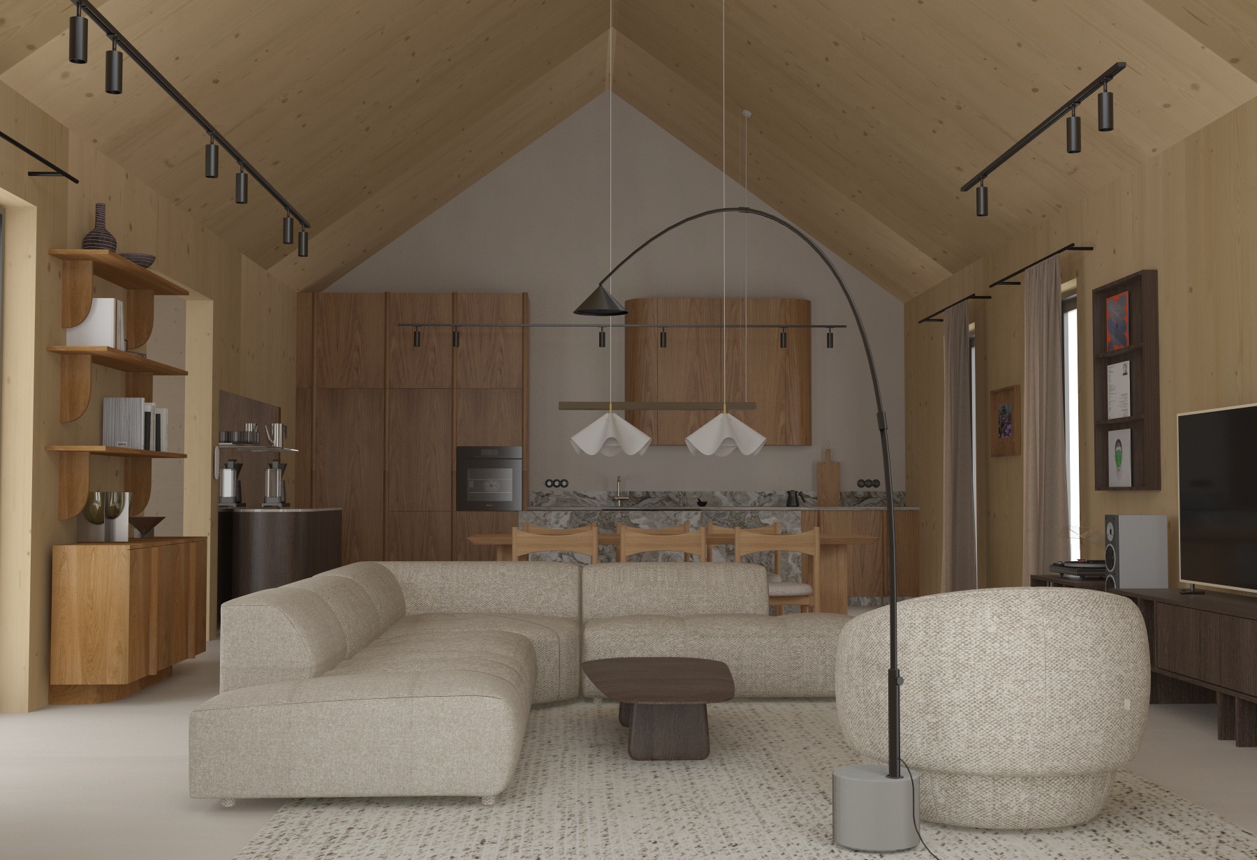 architectural photography ultra realistic 8k resolution cinematic lighting maintain original geometry kitchen wood strictly preserve and enhance the rich saturated wood color from the base image keep the wood tone deep warm and high contrast walls smooth knot free clt panels in a warm honey toned natural wood clearly darker than the floor floor and far wall seamless beige microcement curtains translucent white linen soft light diffusion lighting soft morning sunlight streaming from the right side kitchen island semi matte natural stone dining table matte knot free oak wood