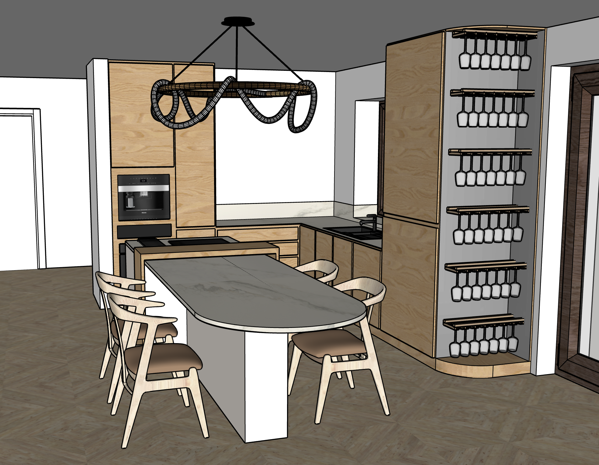 a modern elegant kitchen interior with light oak wood cabinets and a seamless marble countertop in soft gray the chairs feature a light beige wood with dark brown leather cushions the floor exhibits a natural wood herringbone pattern in a warm beige tone the atmosphere is inviting and sophisticated with a sleek black metal chandelier as the centerpiece glass wine holders are neatly organized adding a touch of class there is a glass display on the right lit with leds and with mirrors on both sides the walls and ceiling are painted in a clean white providing a crisp and airy feel to the space