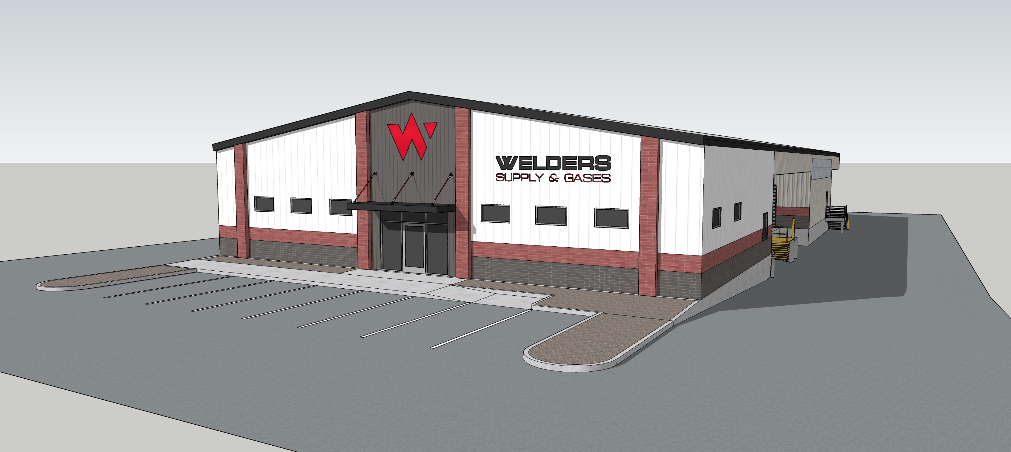 industrial warehouse middle of a sunny day pickup truck in a parking spot show rugged man walking to front door add landscaping in front landscaping beds make asphalt a little wet