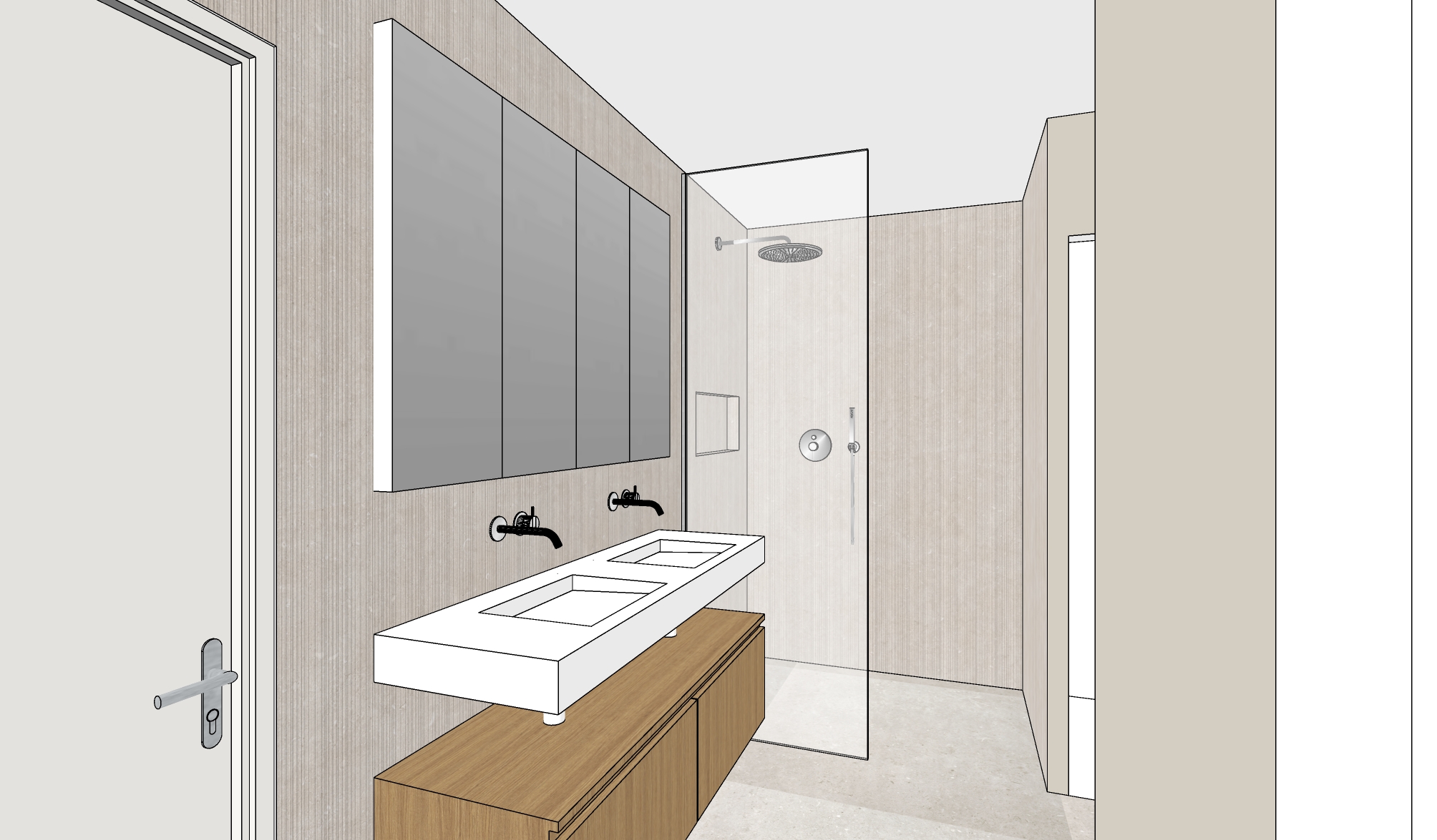 sol en travertin plan vasque en corian blanc mat meuble suspendu en bois de chene miroir paroi vitr e fa ence aux murs beige stri e