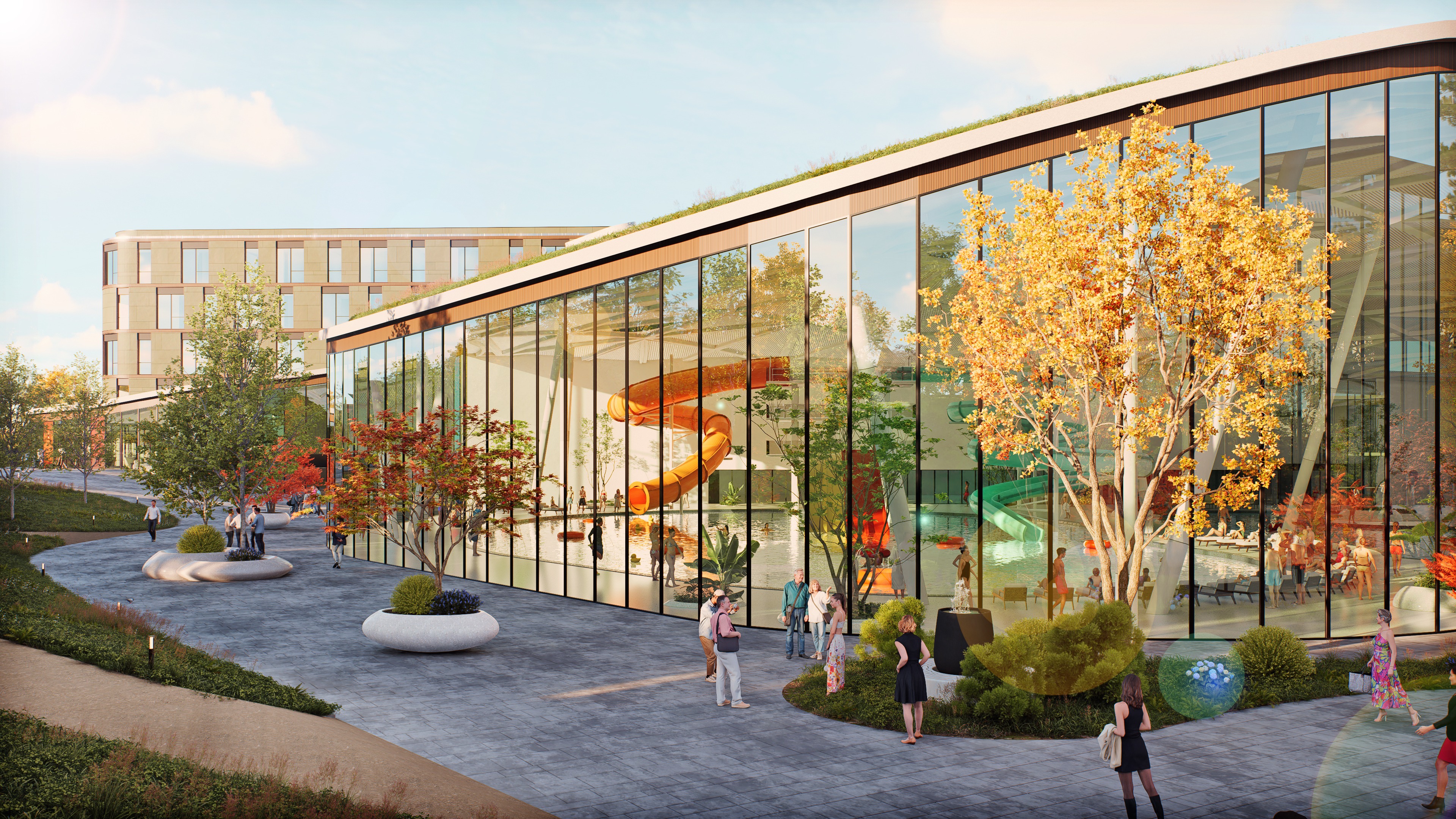 important preserve the existing geometry and the existing context exactly as provided preserve the existing windows do not add new windows do not modify alter reinterpret add remove scale or reshape any geometry do not change the site surroundings street layout neighboring buildings vegetation or context elements do not modify geometry scale proportions buildings road layout sidewalks or surrounding context in any way do not modify text soft sunny noon atmosphere diffused neutral natural daylight with subtle tones cinematic architectural mood weak interior lighting 4000k slight glowing from inside large glass surfaces with realistic reflections soft mirror effect environmental reflections of sky and surroundings important do not add new windows
