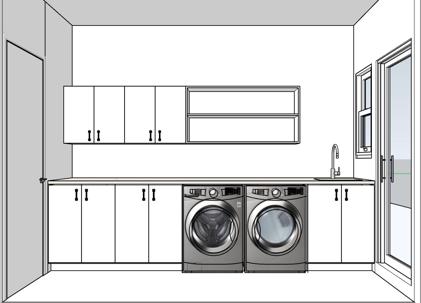 render this laundry room washer and dryer upper cabinetry door to the left and glass door and window to the right