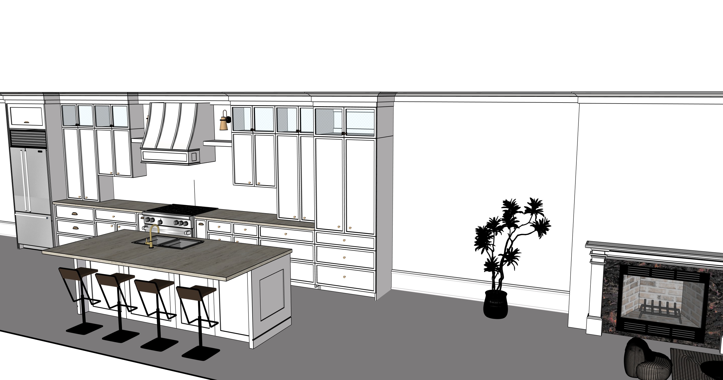 please render it in the farm house style the island is white face with travertine countertop kitchen countertop is also travertin