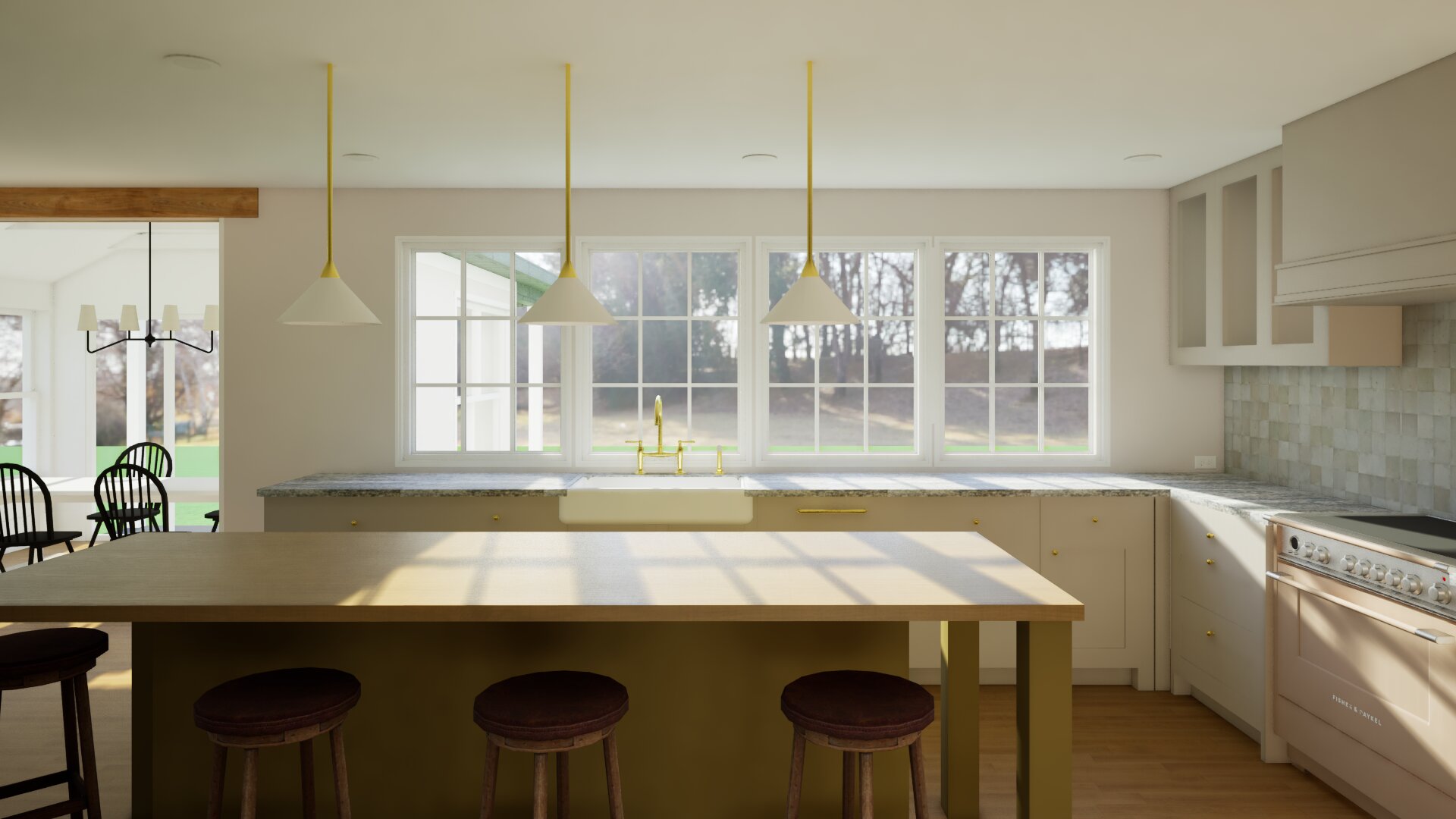 make the cabinets by the stove glass and add dishes in them add a few kitchen items on the counters