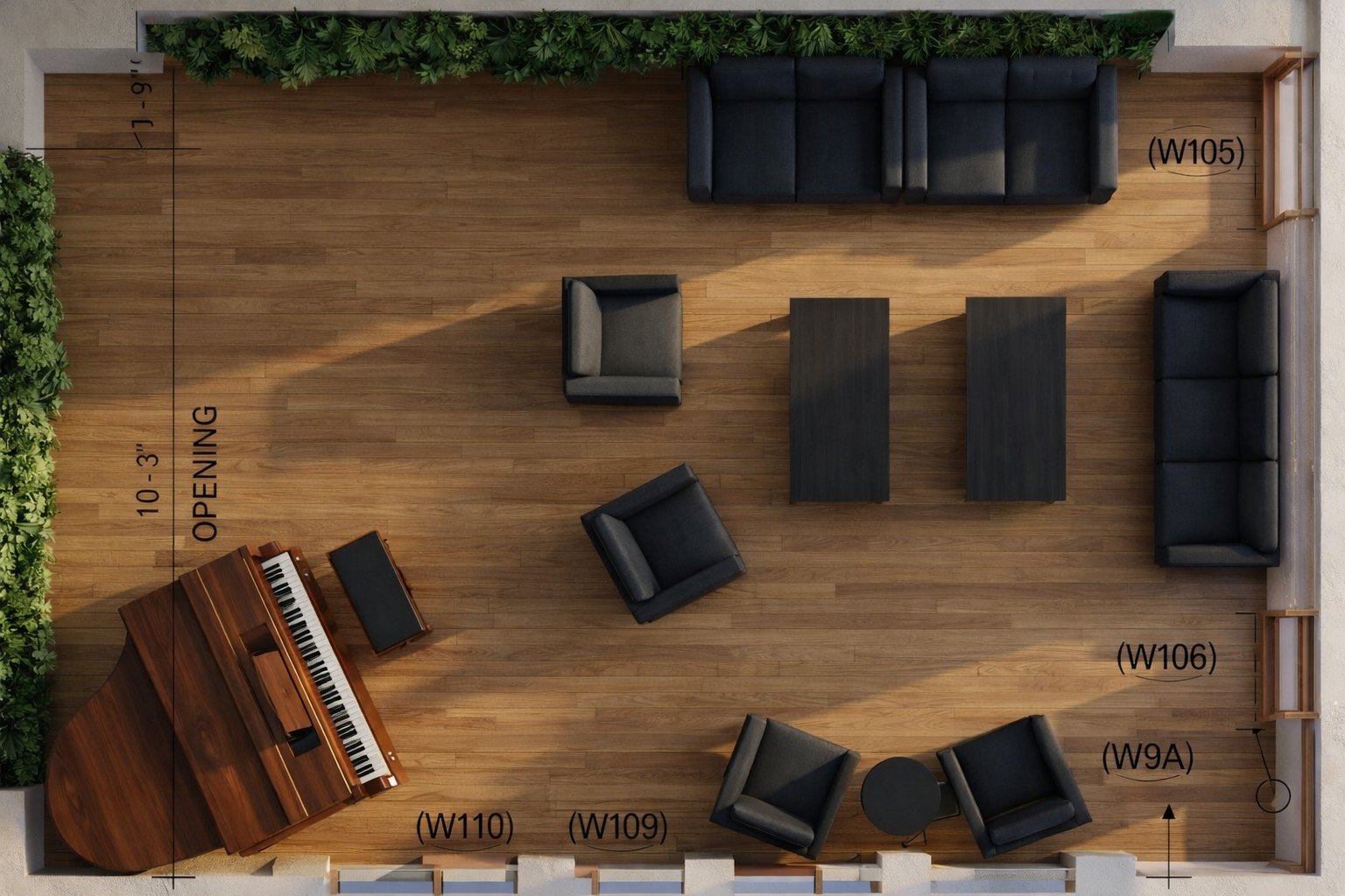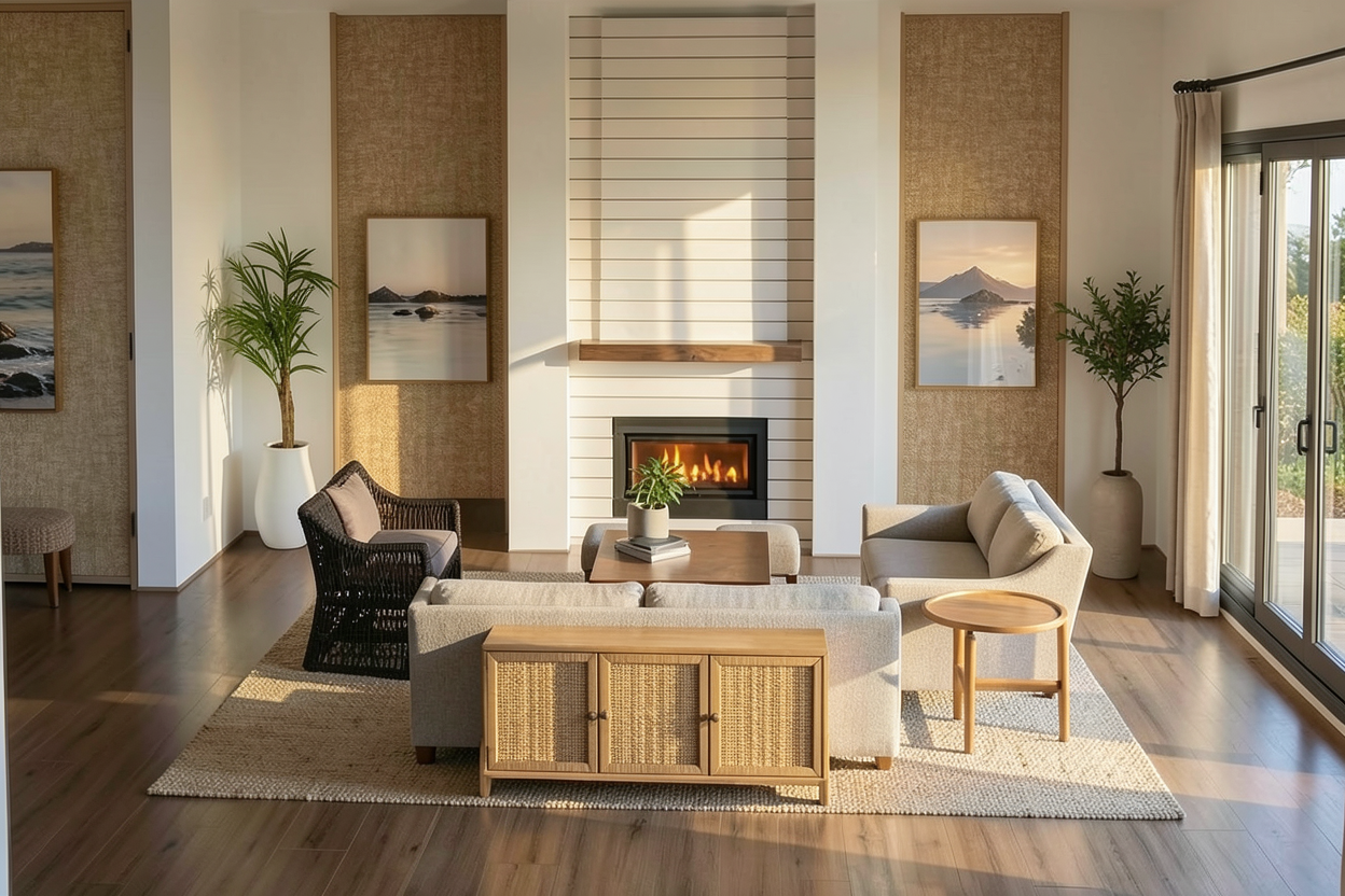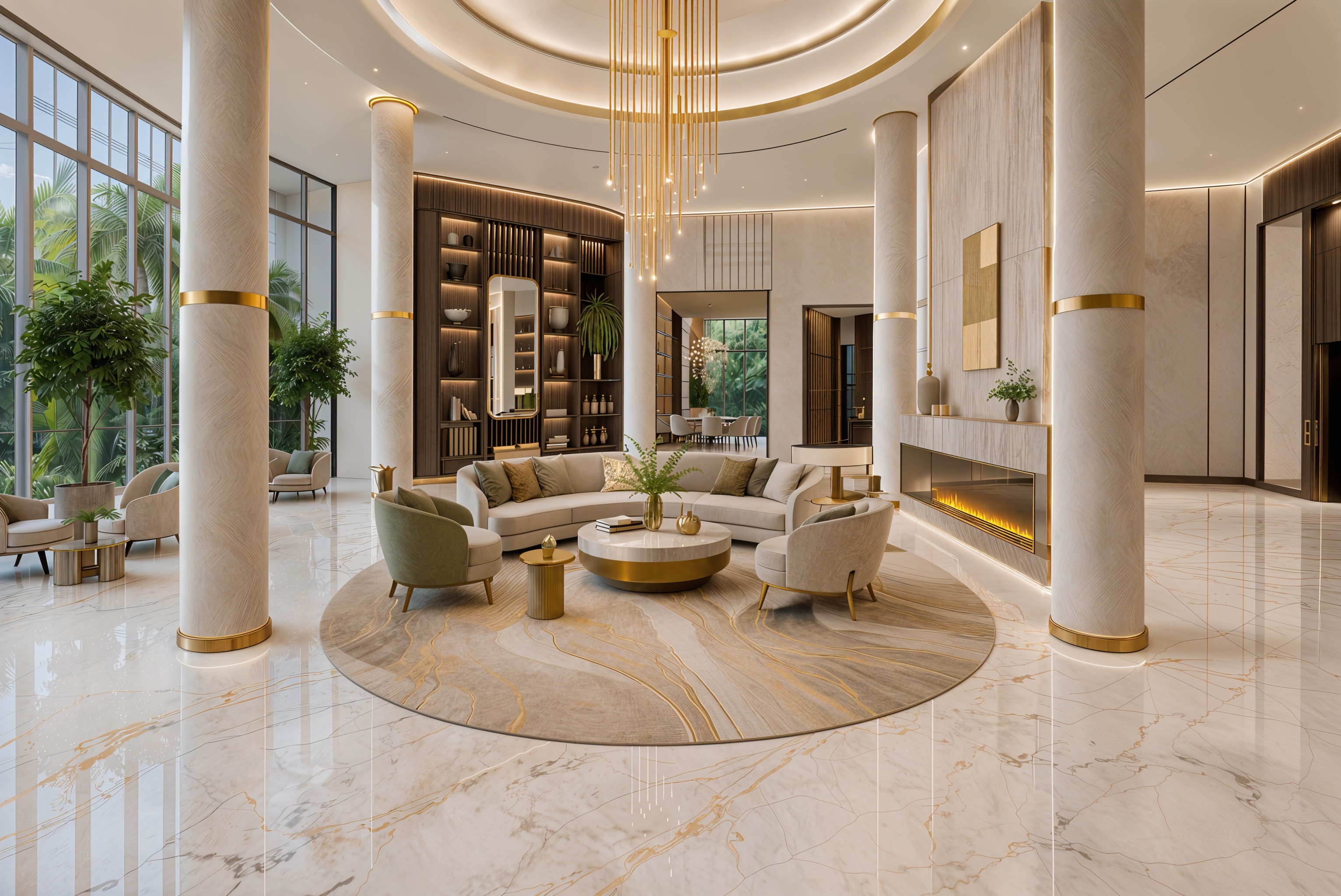 luxurious grand hall interior featuring large marble pillars in a soft cream hue polished marble floors with elegant gold veining a central seating area with plush beige sofas arranged around a circular gold coffee table a lavish chandelier with cascading lights hangs from the ceiling casting a warm glow large windows allow natural light to pour in enhancing the serene and sophisticated atmosphere modern fireplace with a sleek marble finish and gentle flames earthy green plants in gold pots add a touch of nature overall mood is opulent and serene in a palette of cream gold beige and green